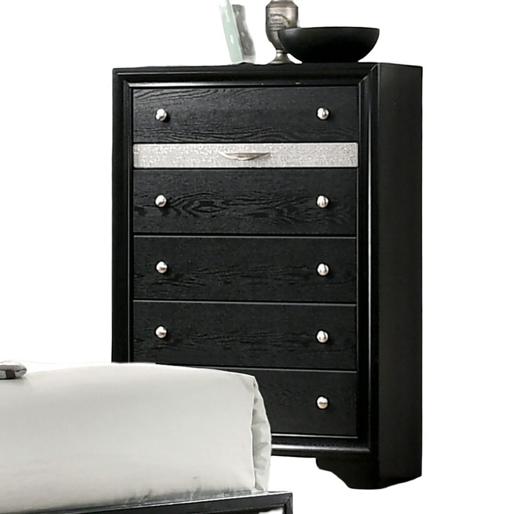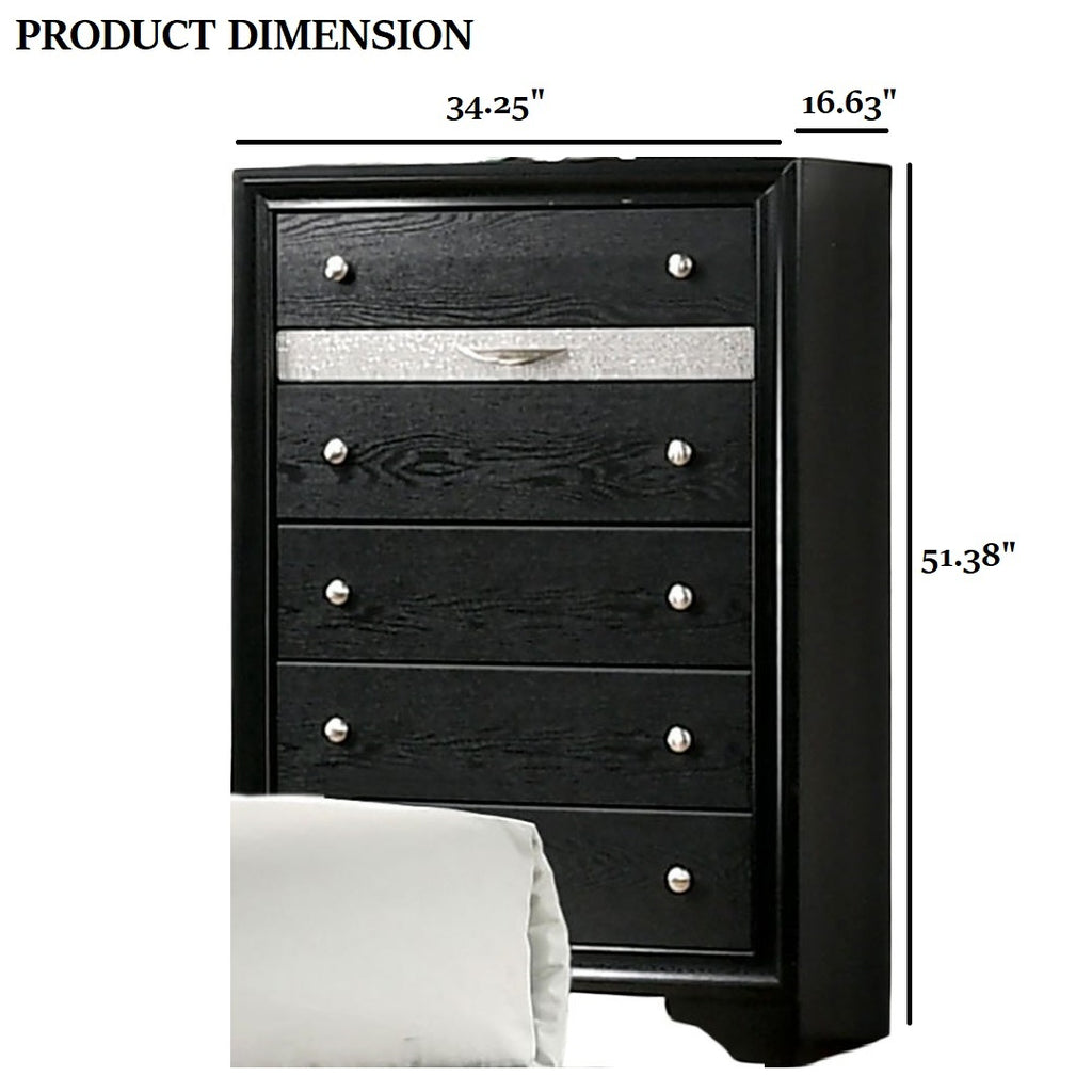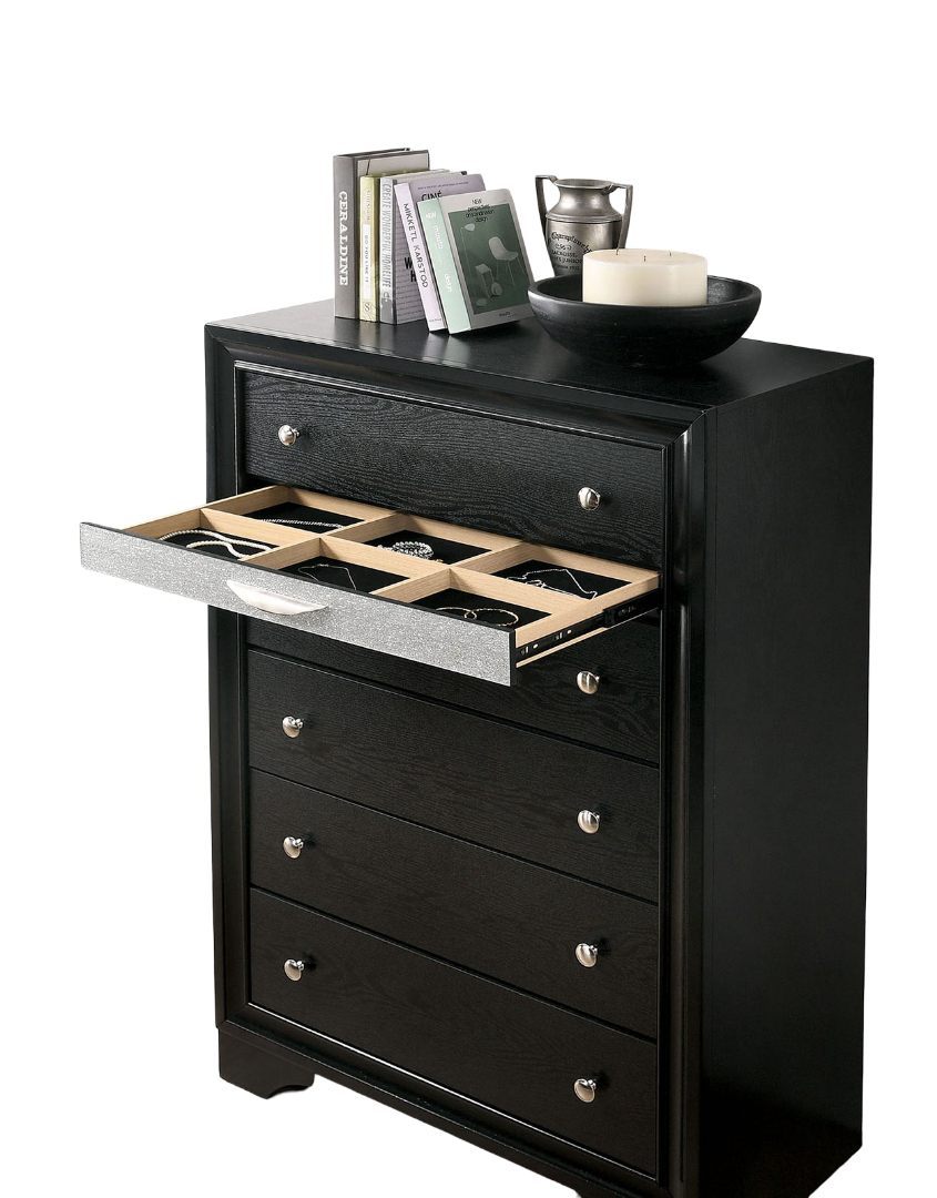 Brighten your room with the sheen and shine that this chest delivers. The gleaming finish promotes a refreshing clean aesthetic with silver lines that glisten. Silver tone pulls detail the case goods brilliantly, offering an easy grasp to the one-of-a-kind jewelry drawers. Glimmering and glamorous, create the room you have always dreamed of.