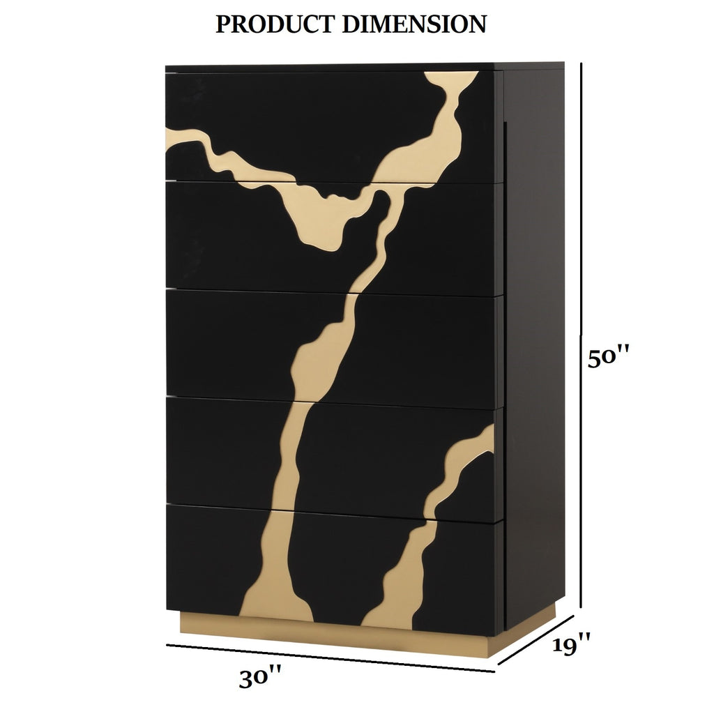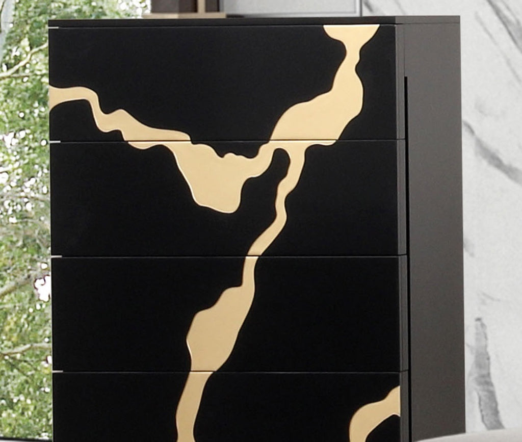 Black with ornate gold-painted pattern, embodying a striking contemporary aesthetic combining dark tones and metallic accents. Crafted from a blend of pinewood, poplar, birch, and engineered wood—delivering sturdy construction with layered material design.