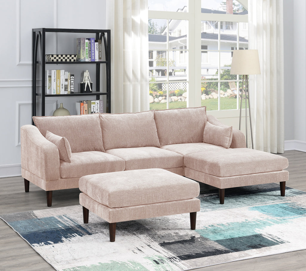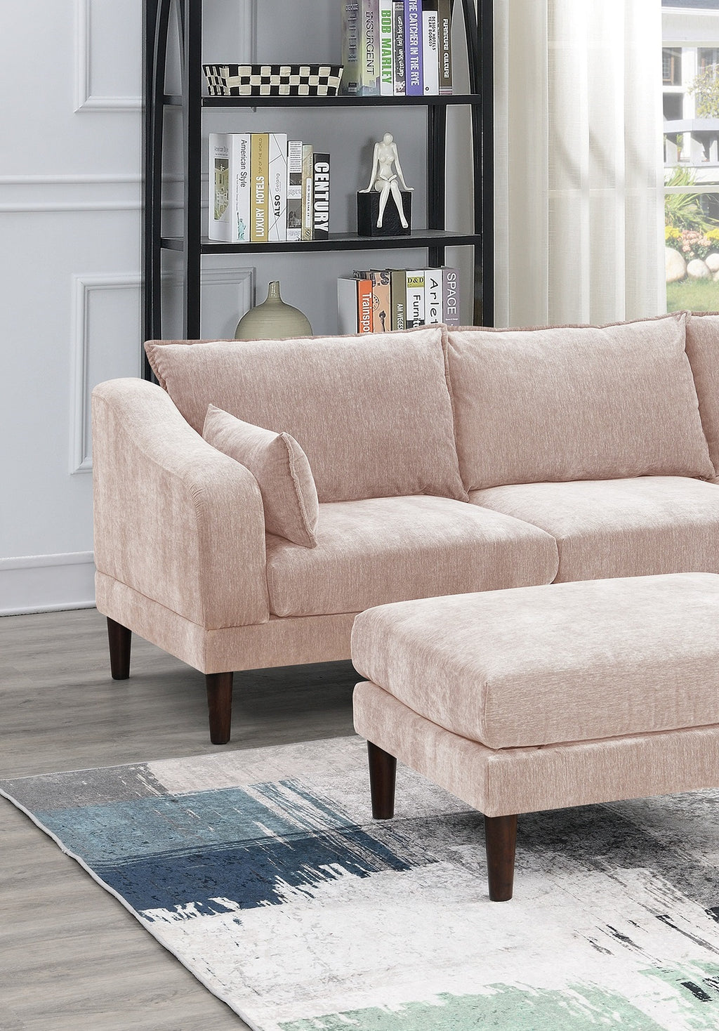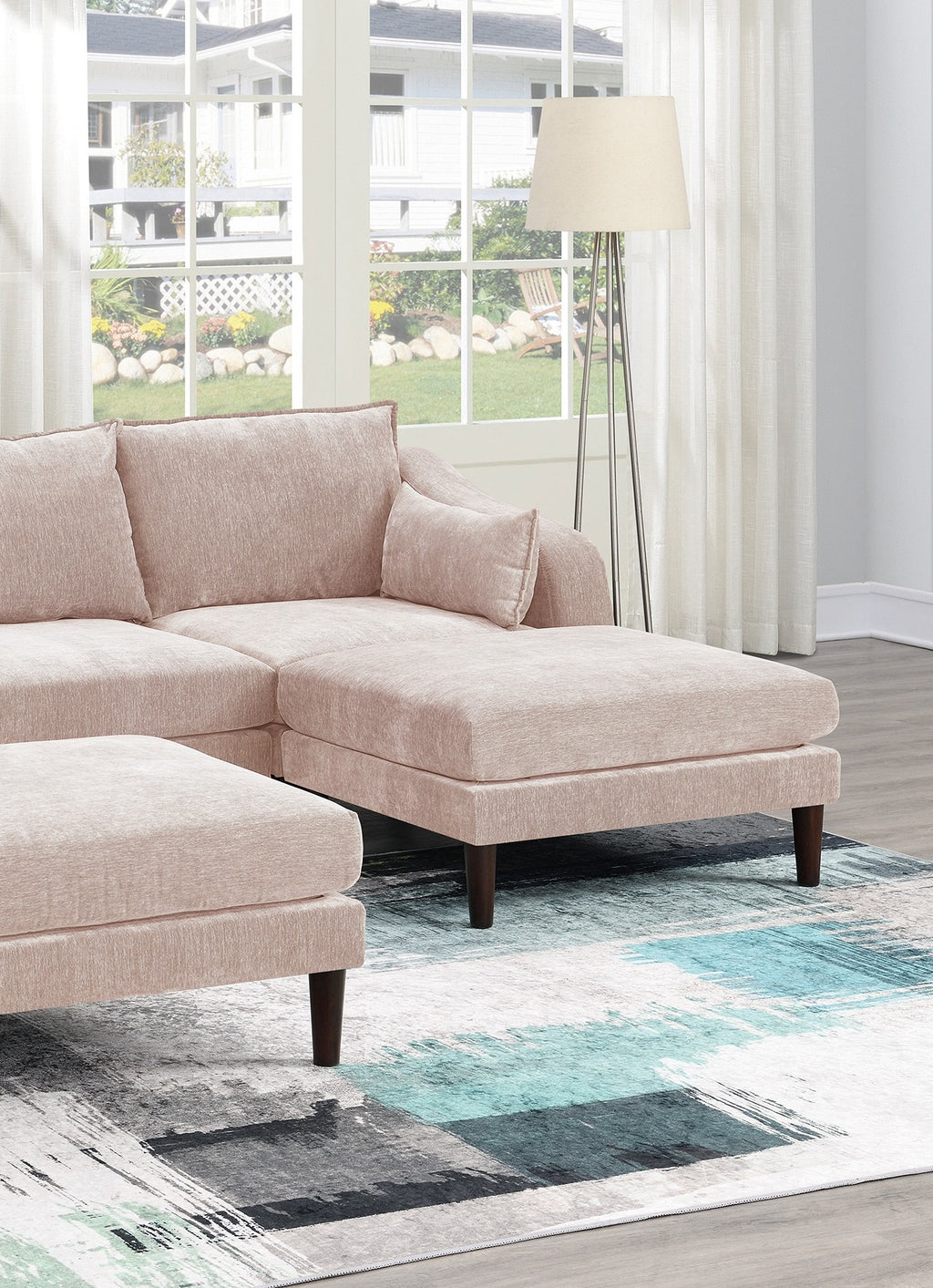 Product Description:- As the saying goes, variety is the spice of life. This 5-piece modular sectional echoes this message with contemporary furnishings for the creative and the person that wants options. Whether you’re looking to relax with a traditional sectional design or would like to break up your space with a ottoman and/or an armless chair, this set offers a variety with modern luxury design. Relax with wide seating spaces and plush back support adding to the living space furniture that is not only visually appealing but offers real comfort. Available in a smooth suede-like fabric in blush and mineral.