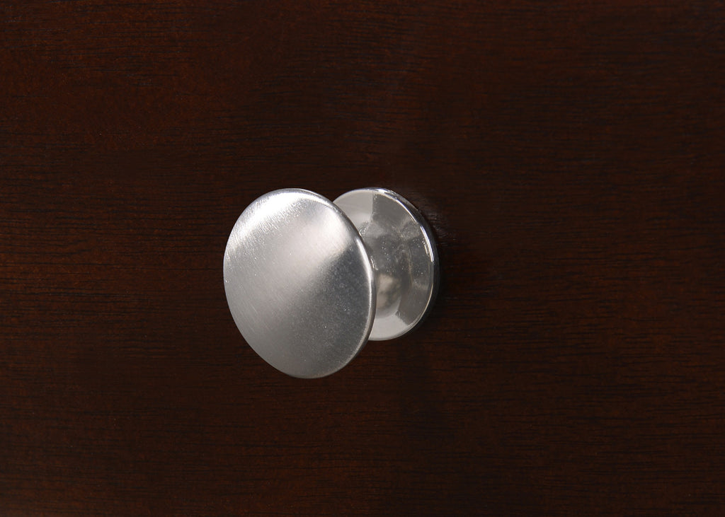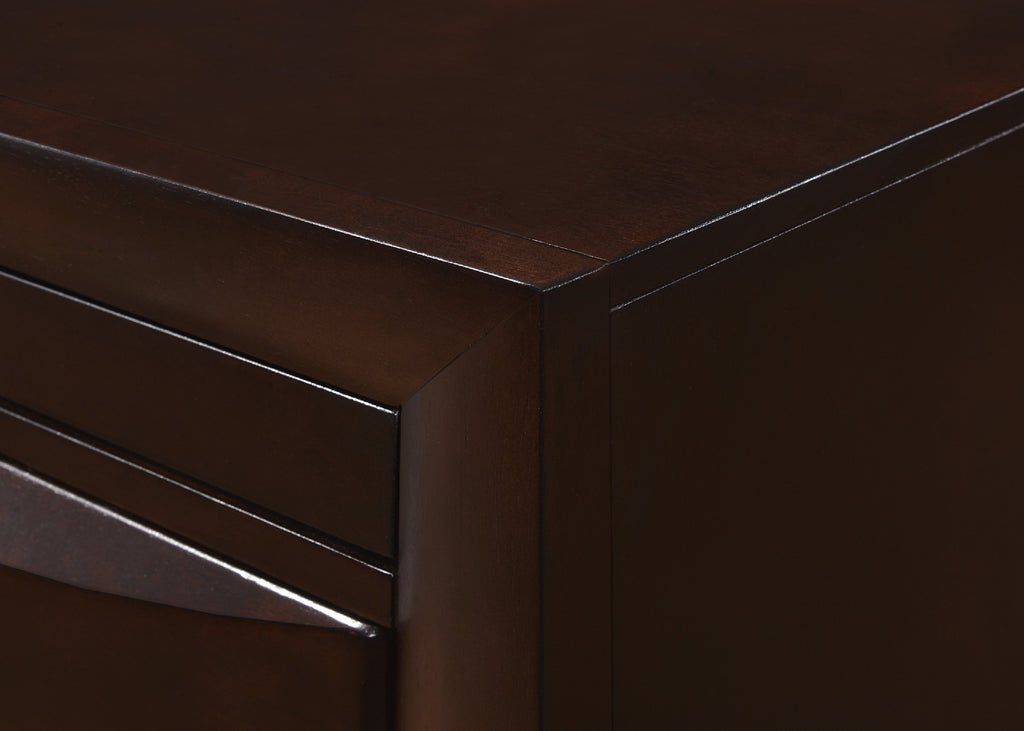 A sleek silhouette is wrapped in a rich finish that blends seamlessly with the exposed wood on the bed. Bold beveled drawer fronts dress up the front of the nightstand and are crowned with silver finish knobs for a sophisticated modern look. Top with a lamp, frames and decorative accents for a beautiful and functional addition to your contemporary bedroom suite.