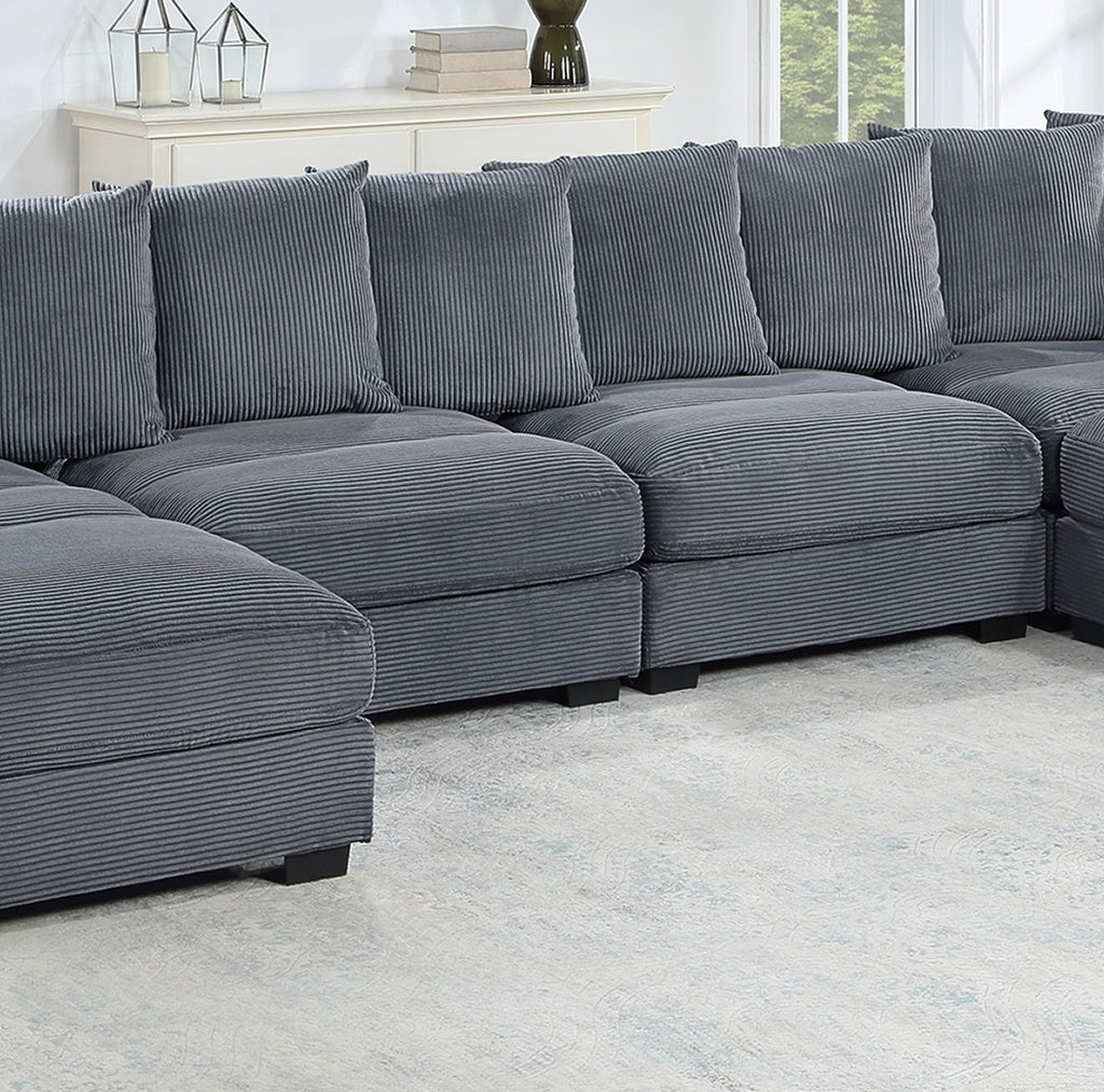 Unwind in endless configurations with the stunning modular sectional. This 6-piece sectional offers the perfect blend of flexibility and style. With a Left Arm Facing Chair, Right Arm Facing Chair, Armless Chair, and Ottoman, you can create the ideal layout for your living space. The square arms offer a contemporary touch, while the low legs contribute to a modern aesthetic that complements any interior décor. This sectional comes complete with 8 luxurious back pillows and 2 throw pillows, adding a touch of elegance and providing extra lumbar support. Whether you're lounging with family or entertaining guests, this modular sectional promises unparalleled comfort and versatility for any occasion.