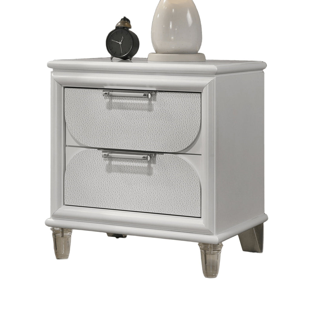 Contemporary Pearl White Fabric, Solid Rubberwood, Engineered Wood LED on Headboard And Mirror Beveled Mirror Embossed Panels Acrylic Handles And Front Legs w/ Back Metal Legs Felt-Lined Top Drawer Metal Glide English Dovetail Foundation required
