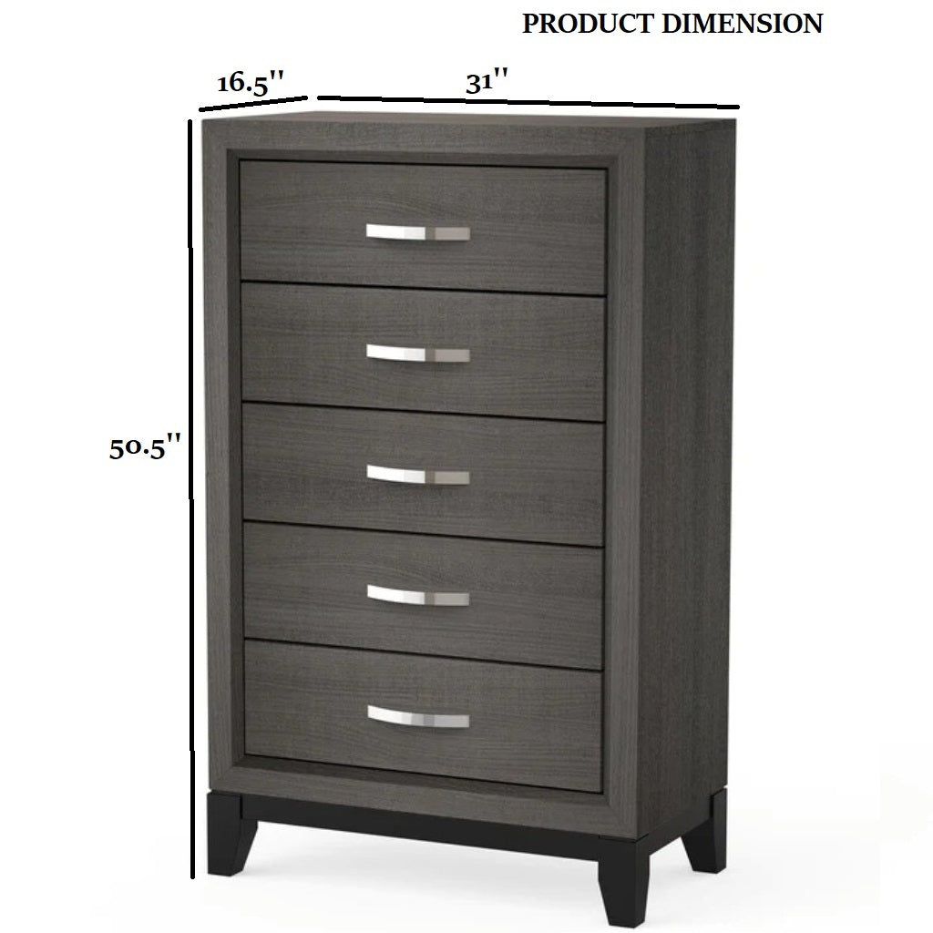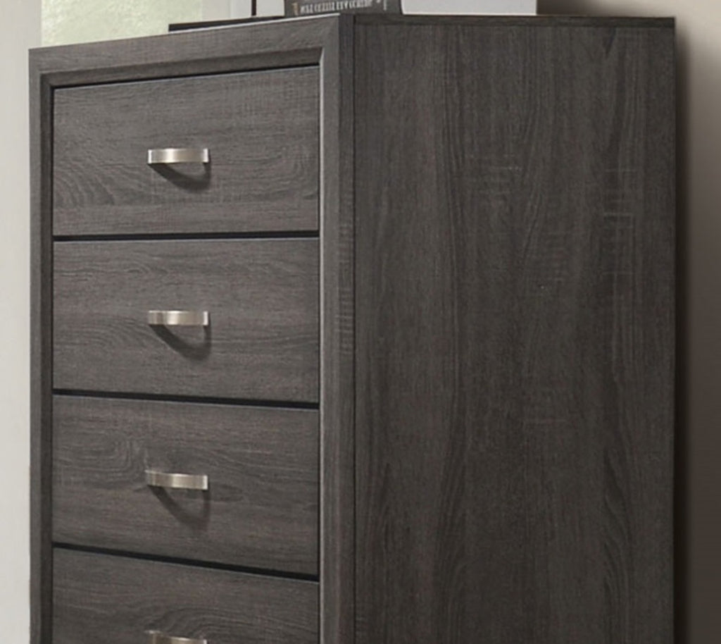 Contemporary styling with a bright gray finish. Crafted from engineered wood and paper veneer, featuring wooden legs and two‑tone design details. Hardware consists of sleek nickel bar pulls.