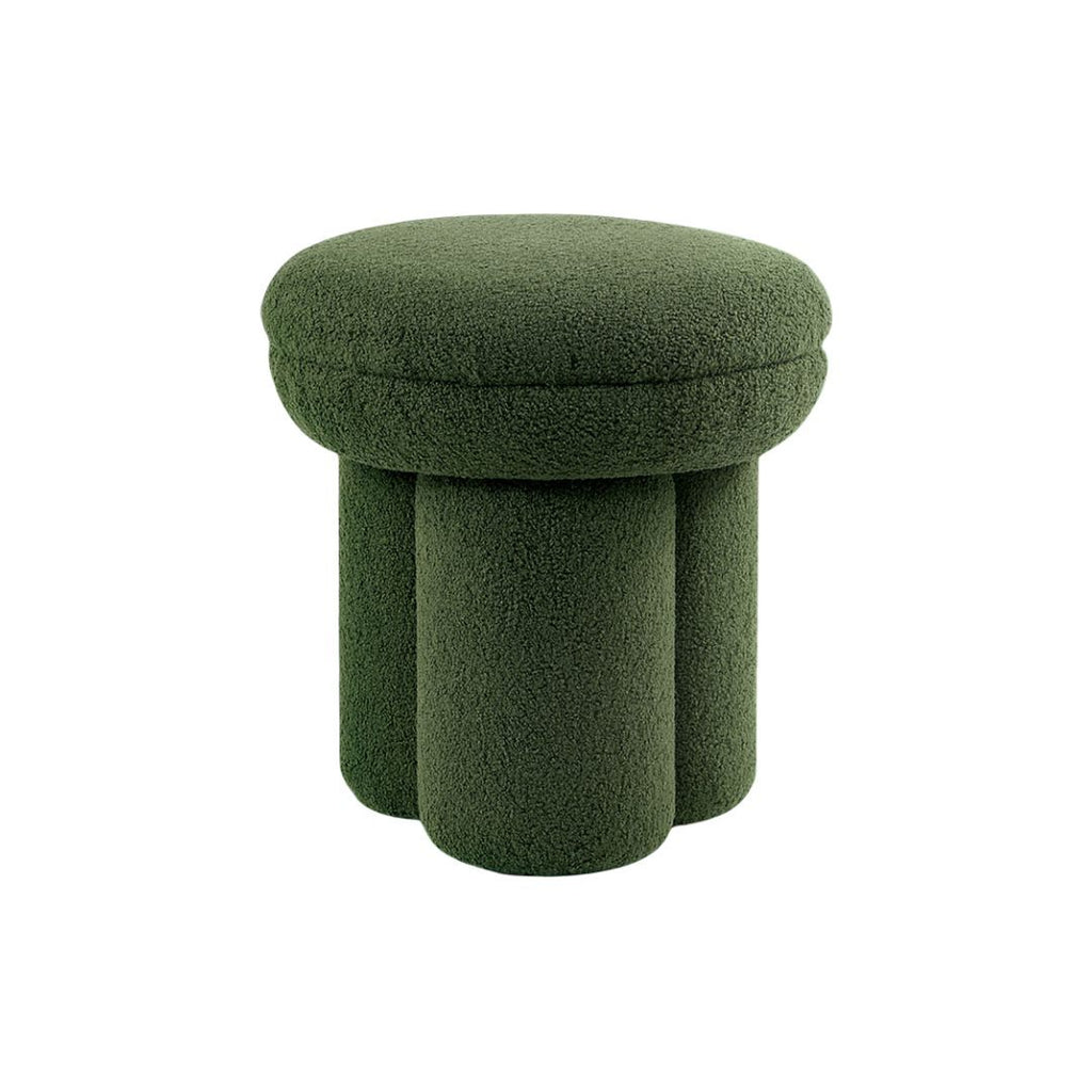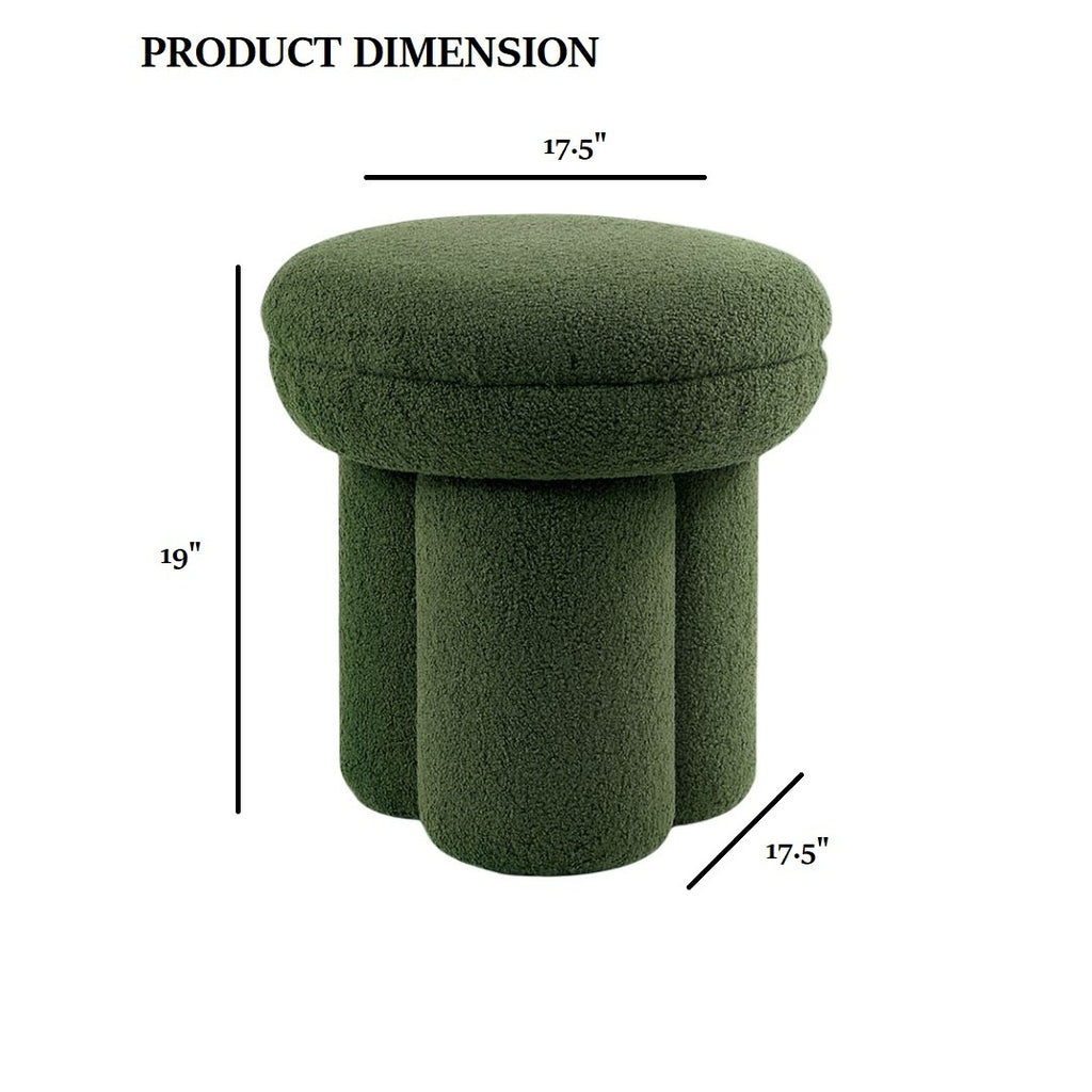 The stool has a mushroom‑shape / round top ottoman style a smooth dome‑like seat without separate back or arms. Upholstered in shearling teddy‑like fabric in a saddle green color. This gives it a cozy, soft, plush texture. Base / support: pedestal base style, i.e. a single base rather than legs; gives a clean and minimal look.