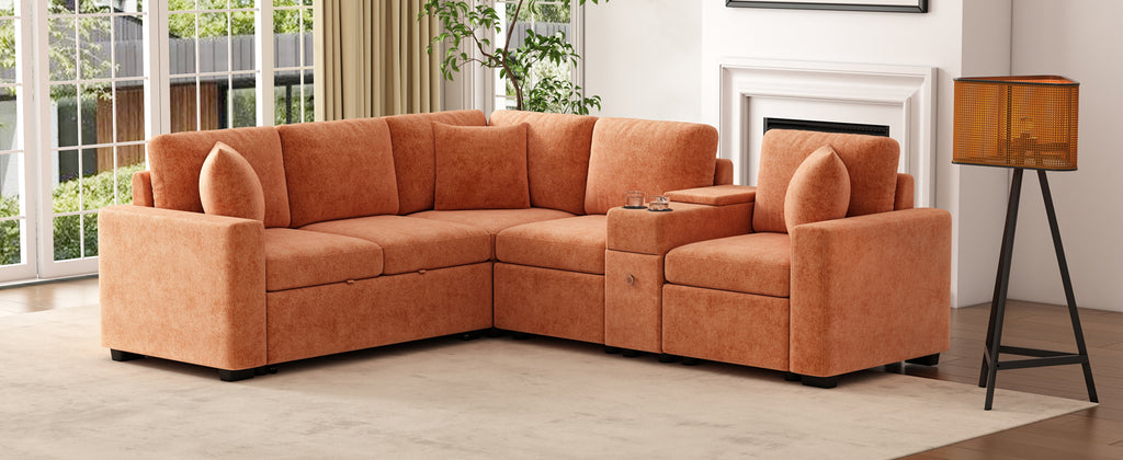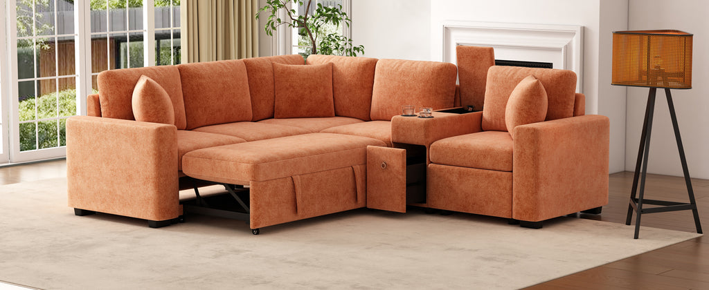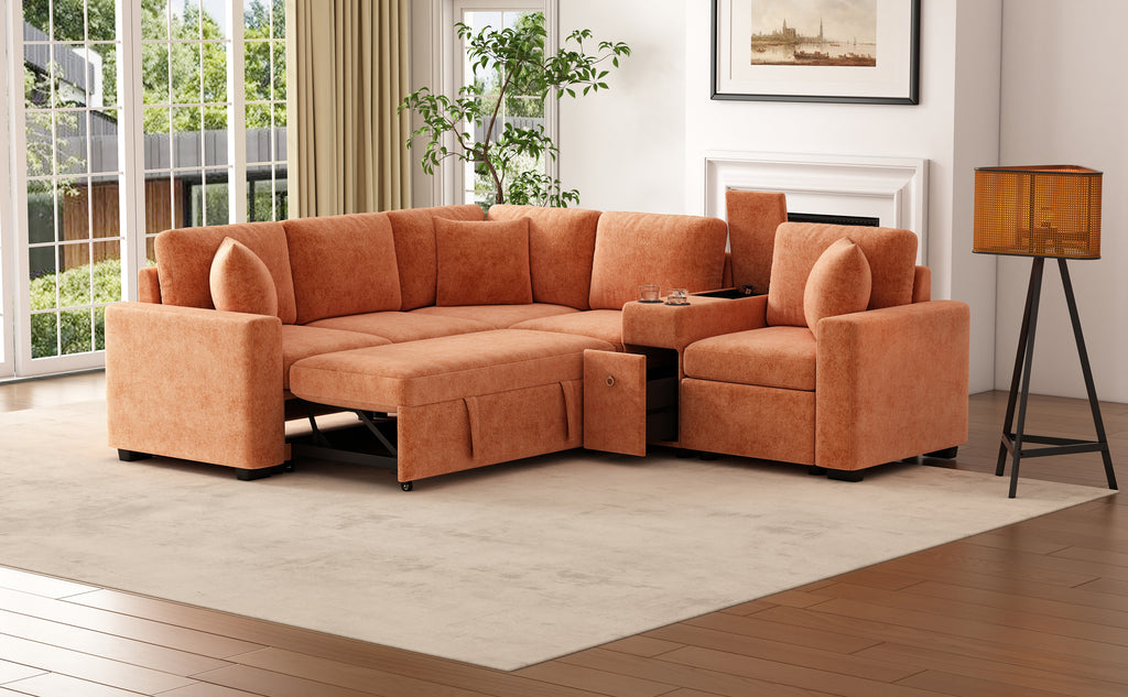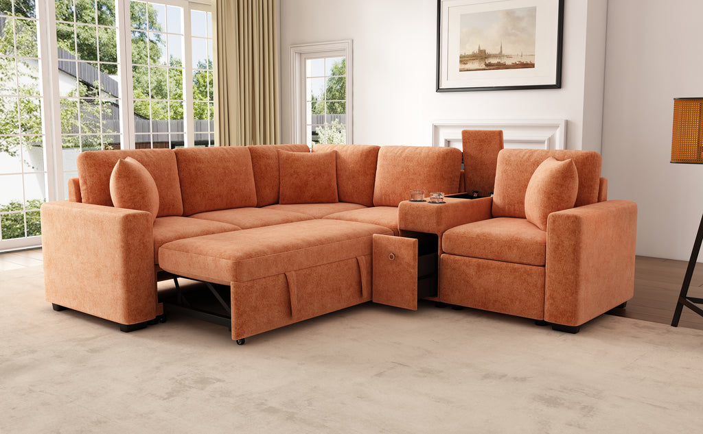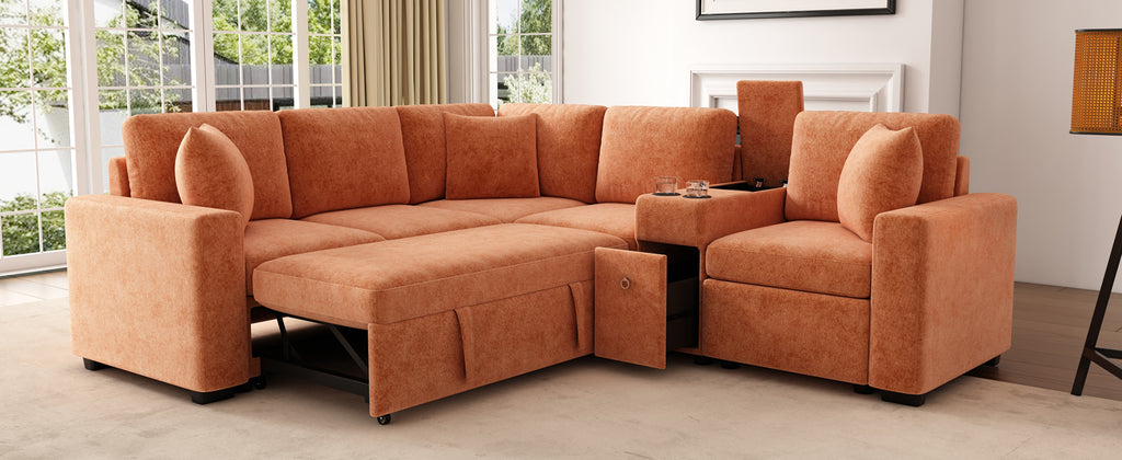 This versatile modular pull-out sofa offers a perfect blend of functionality, comfort, and style. Its customizable design allows for three different configurations, while the effortless pull-out bed provides a spacious 67”W × 44.5”D sleeping area, making it ideal for guests and multifunctional spaces. Smart storage solutions, including a hidden armrest compartment and spacious drawer, help keep essentials organized and clutter-free. The built-in cup holders add convenience, while adjustable, removable pillows enhance comfort. Wrapped in luxurious chenille fabric, this sofa offers a soft, breathable, and durable upholstery, making it the perfect addition to any modern home.