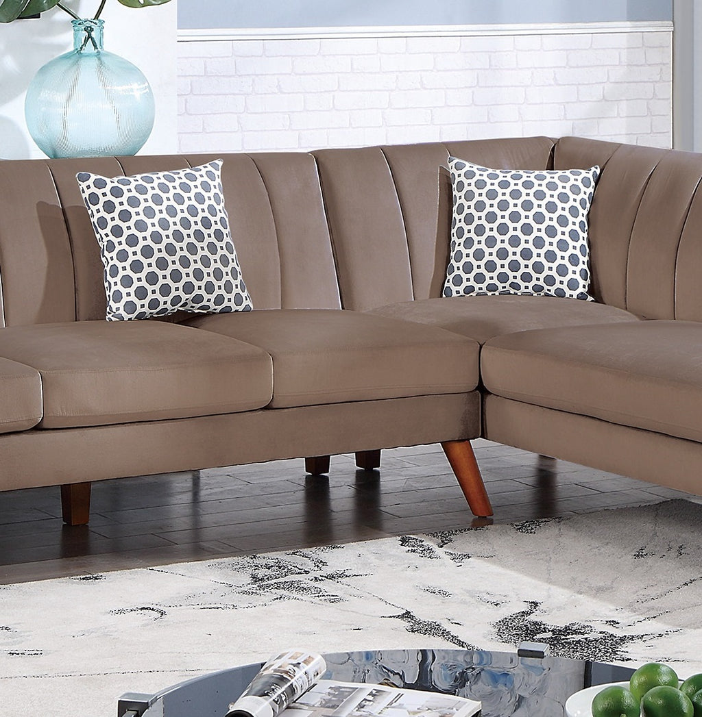 Its vintage charm and style are unmatched, which delivers this 2-piece sectional sofa brightening any living space. With clean vertical lines of accent tufting on the back cushion, firm seating, and a curved armrest, entertaining guests' is a piece of cake. This set includes a right-facing chaise and a left-facing sofa, and short wooden angled legs. Upholstered with velvety smooth fabric, this set is available in Dark Gray, Light Brown, and Light Gray.