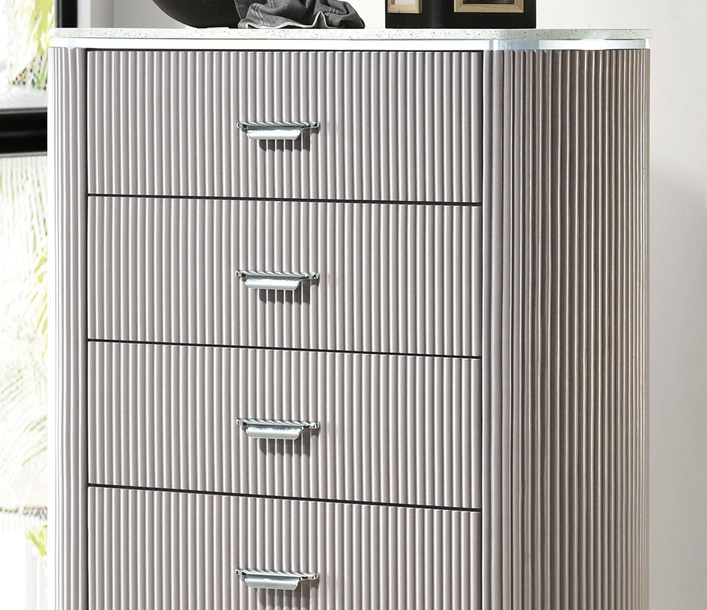 A contemporary design finished in Light Gray, featuring vertical reeded paneling with delicate silver line accents for a modern and refined look. Includes a cultured stone (stone-look) top, adding a premium touch to this chest. Drawers utilize French front and English back dovetail joinery, ensuring lasting strength, and operate on metal side glides for smooth movement.