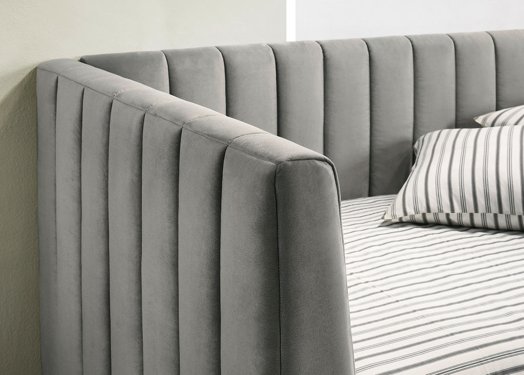Sophisticated and charming, this light gray daybed is elegantly designed to maximize comfort. It's great for lounging with family and friends in the morning hours, and it's great for a good night's rest as well. The tuxedo-inspired design, with arms as tall as the back, lends a classic look alongside the gold metal legs. It's fully upholstered in padded flannelette for overall softness.
