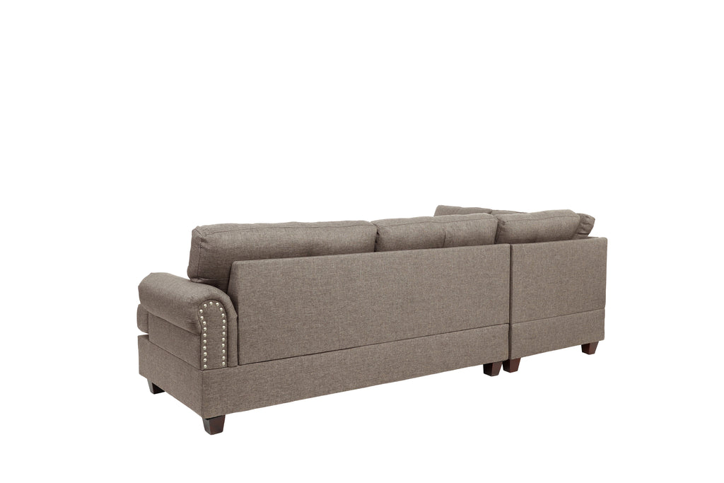 Description :- Achieve the perfect living room design with this 3-piece reversible sectional. Upholstered with simple stitching on the seat and back cushions, this unit works great with any contemporary designed living space. Other details include rolled armed with nickel-finished studding, an armless Reversible Chaise, Cocktail Storage Ottoman, and two accent pillows. Available in Blue Grey, Ash Black, and Mocha (Dorris Fabric).