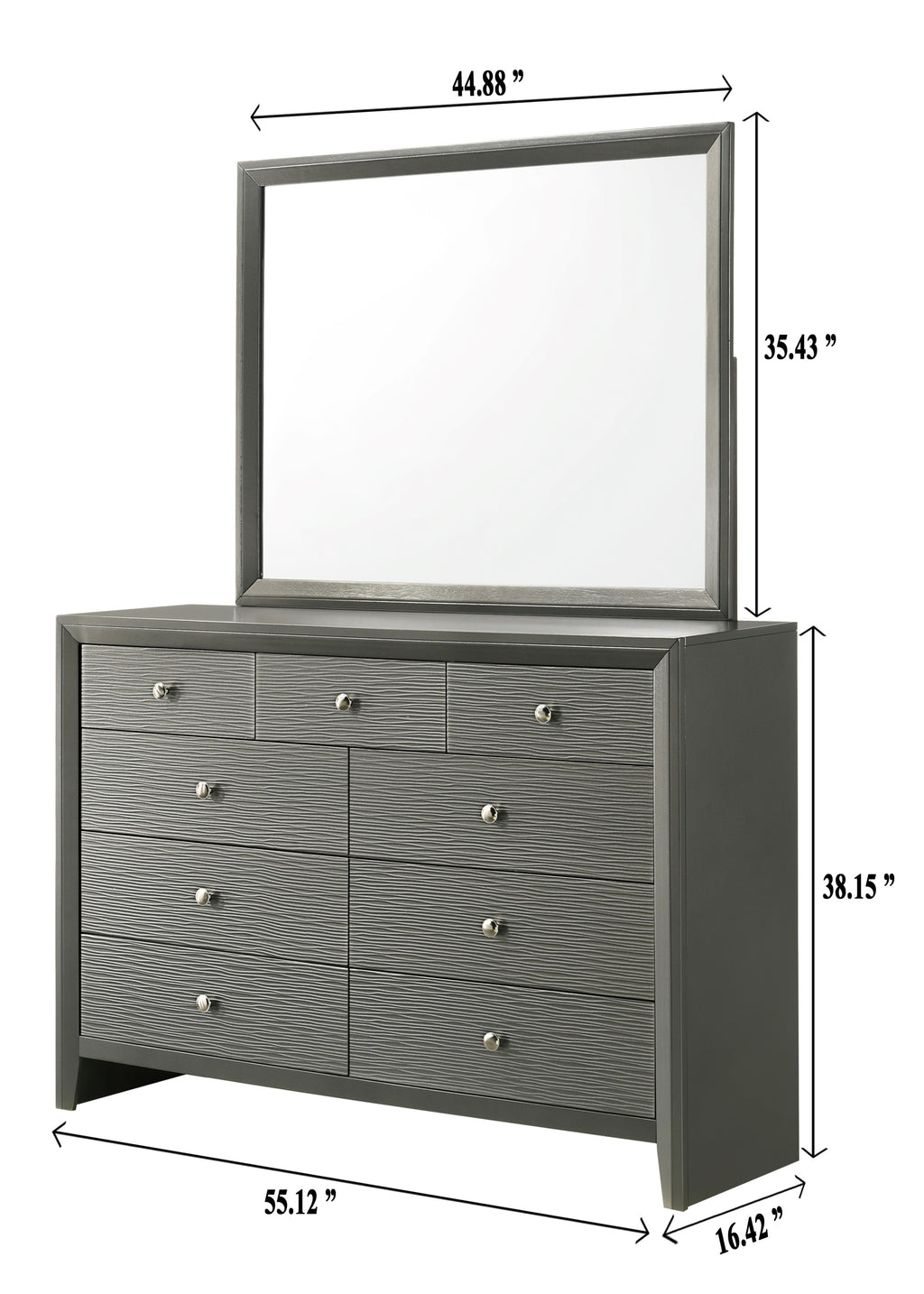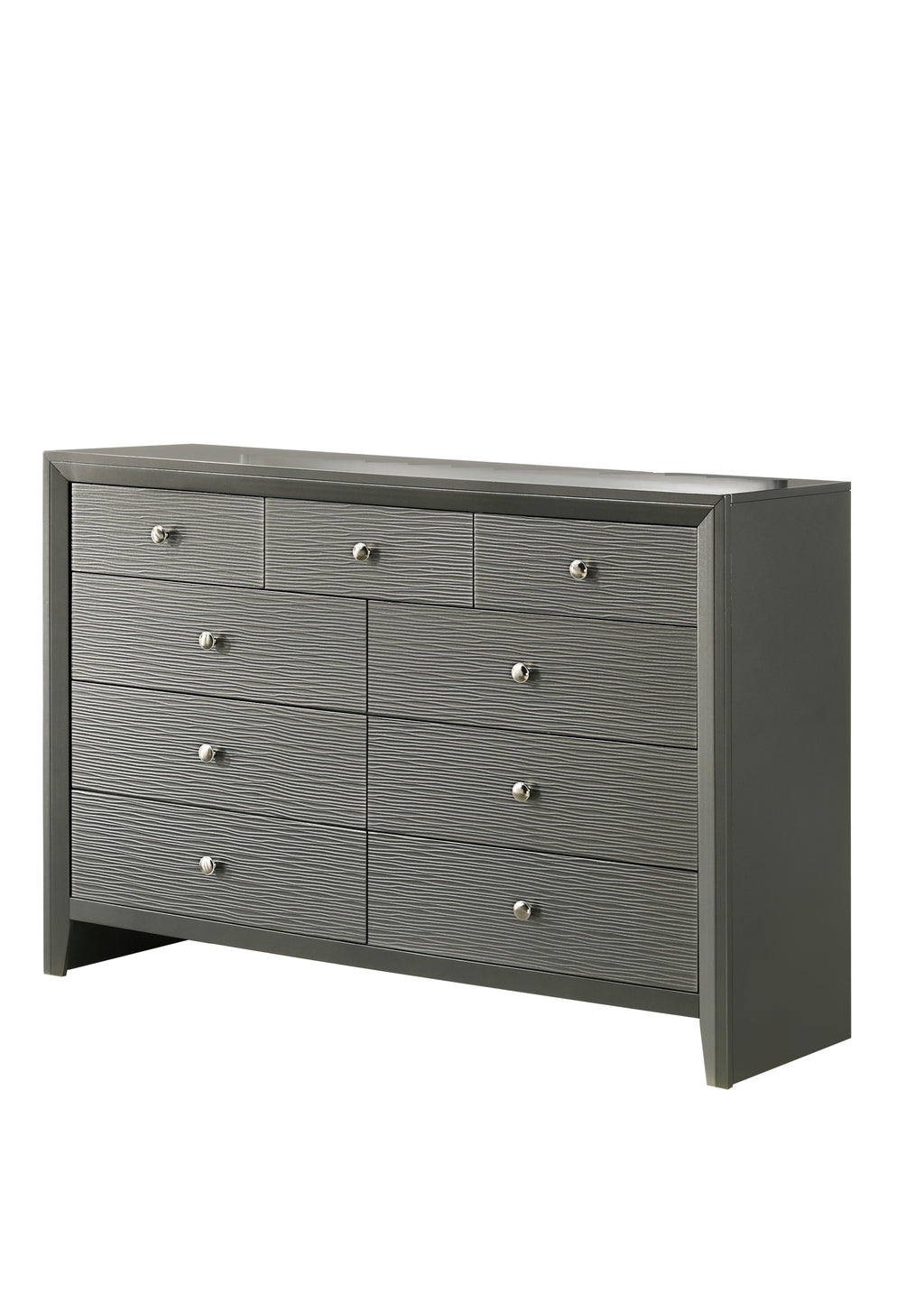 Description:- This Dresser will surely make a statement in your bedroom. It features nine drawers with round knobs, a wood-like pattern on the drawer fronts, and comes in a Gunmetal finish