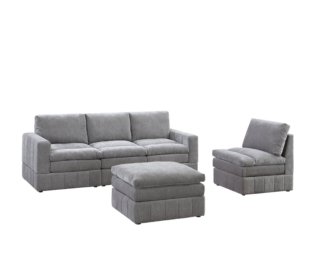 A triple layer cake comes to mind with this extraordinary designed modular sectional set. Each piece is crafted with three tiers topped with plush pillow-top seating and back support to match. Go straight to the moon with this 5-piece set that provide comfort and style that is out of this world. Explore your options with a traditional sectional or try a loveseat, sofa and ottoman combo to suit your style and comfort. This set includes two of each of the following: Right/Left one-arm chair, armless chair, and ottoman. Available in a smooth suede-like fabric in granite and mink.