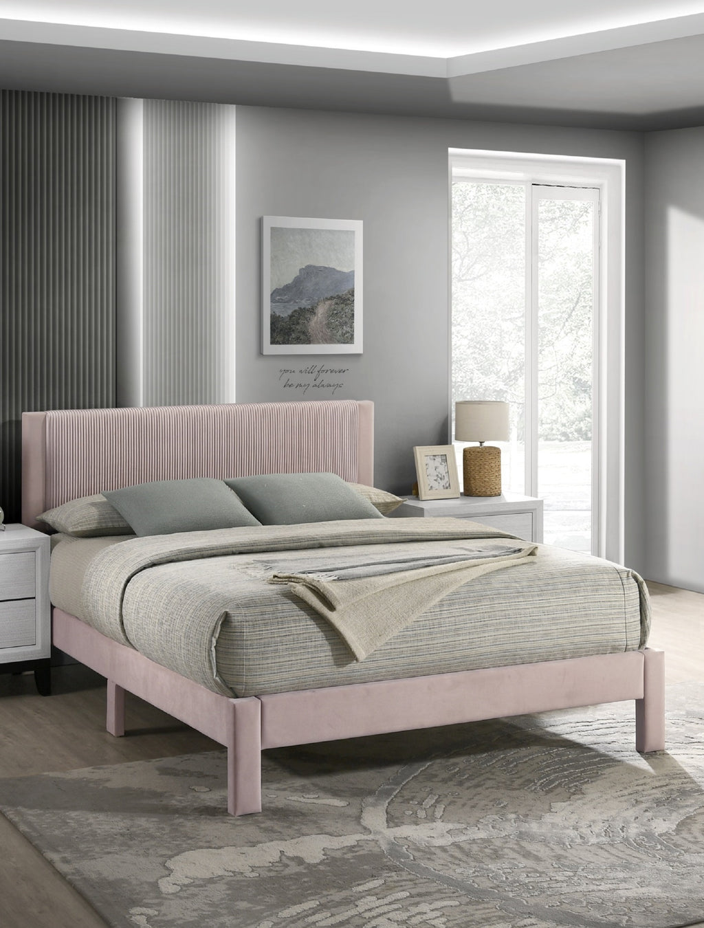 Experience the perfect blend of minimalist design and modern comfort with this elegantly understated bed. Its clean, sharp lines and a sophisticated pink finish create a serene and stylish foundation for any contemporary bedroom. The bed features a streamlined silhouette with a plush, upholstered headboard that boasts a tastefully ribbed texture, providing both visual interest and a comfortable surface to lean against while reading or relaxing. The low-profile frame, supported by sturdy, unobtrusive legs, underscores its sleek, modern appeal, making it an ideal choice for those who prefer a clutter-free aesthetic.