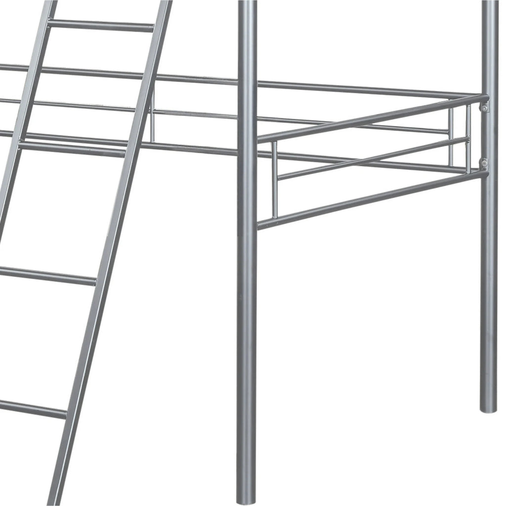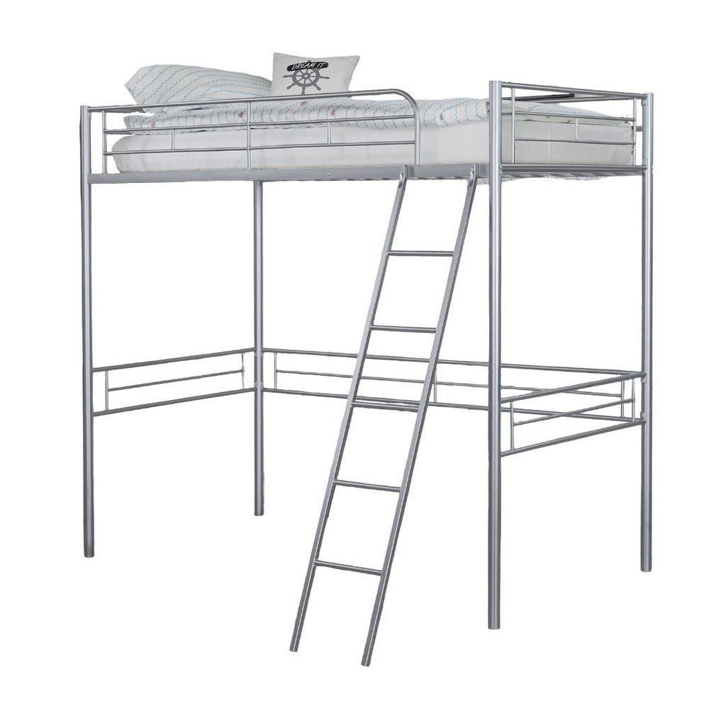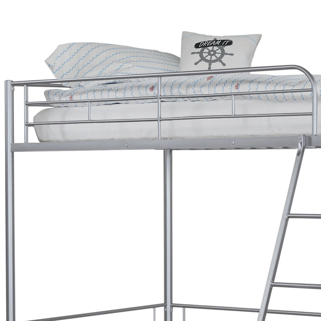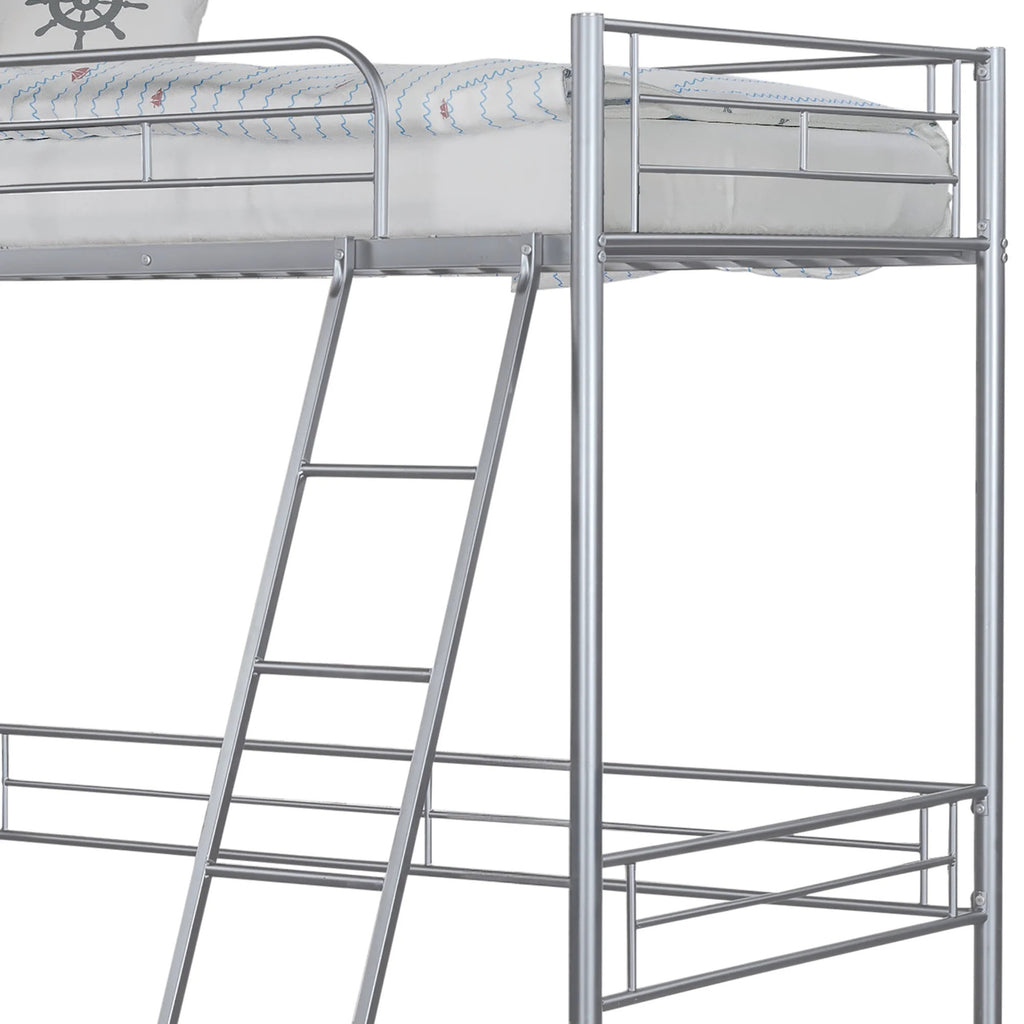 Modern twin-size loft bed crafted from robust Silver-finished metal tubing. With its built-in ladder, it elevates the sleeping area to free up floor space below—perfect for a desk, storage, or play zone in compact rooms.