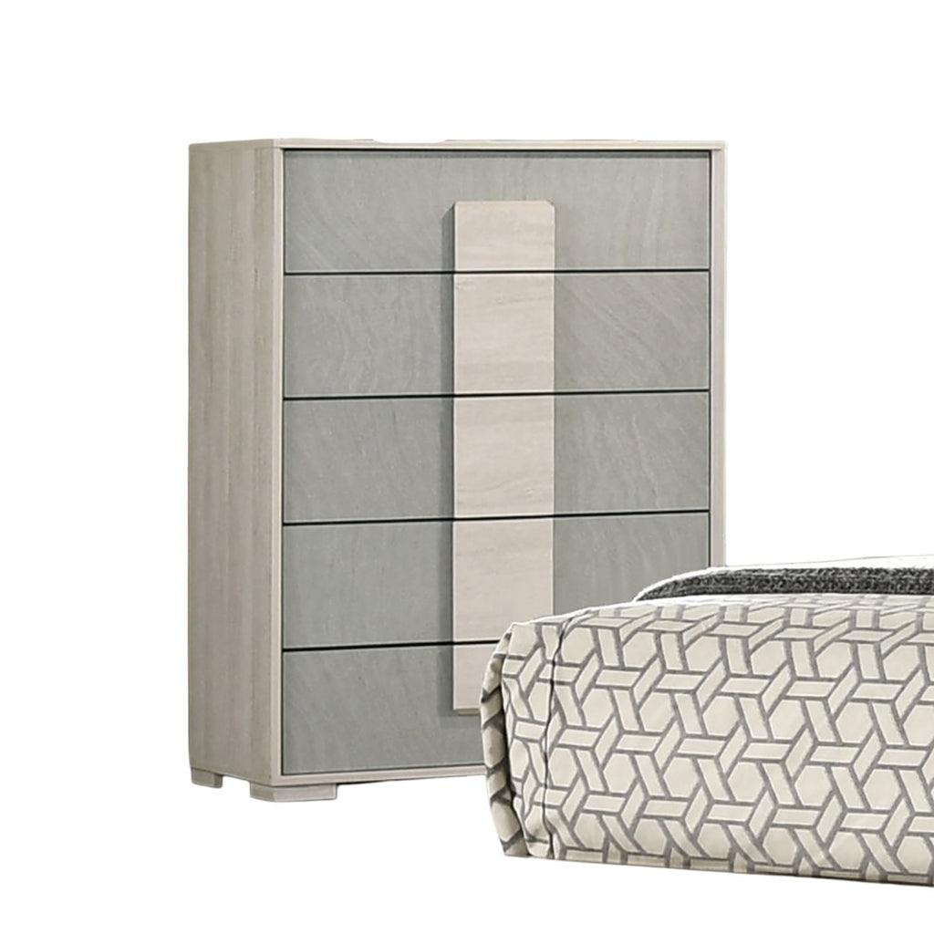 This piece showcases a contemporary aesthetic with a two-tone white wash and stone gray finish—perfect for modern and light-filled interiors. Drawers are built using French dovetail joints and glide smoothly on center metal glides.