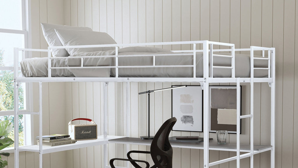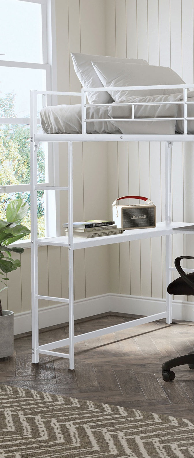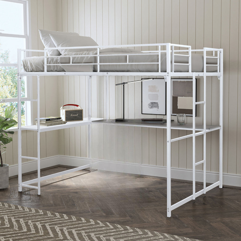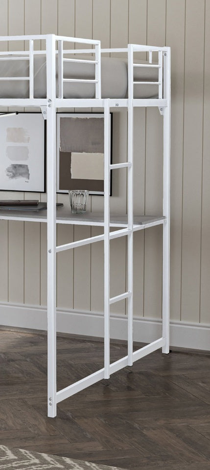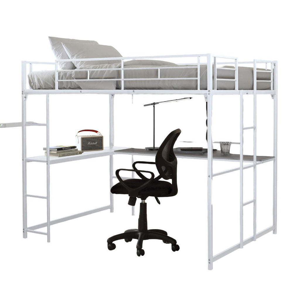 Maximize space with this contemporary white full-size metal loft bed, perfect for any bedroom. Featuring a built-in workstation desk and twin ladders, it offers unmatched functionality and style. Its sturdy design is ideal for study, storage, and creating an efficient, modern living area.