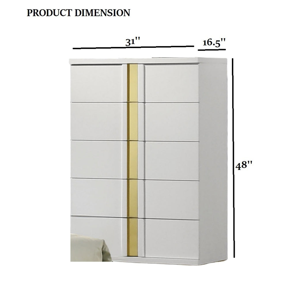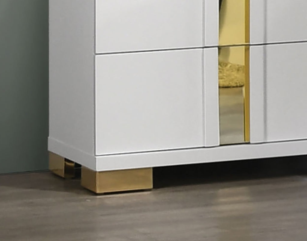 Contemporary design with a crisp white finish enhanced by luxurious gold accents for a chic, modern appeal. Accented with acrylic trim for added sophistication and texture. Bracketed metal legs that provide sturdy support and visual contrast. Dust-proof cases to protect contents inside the drawers.