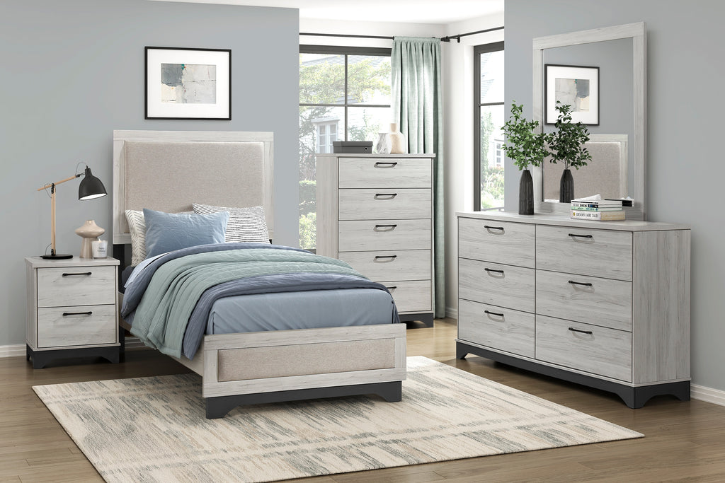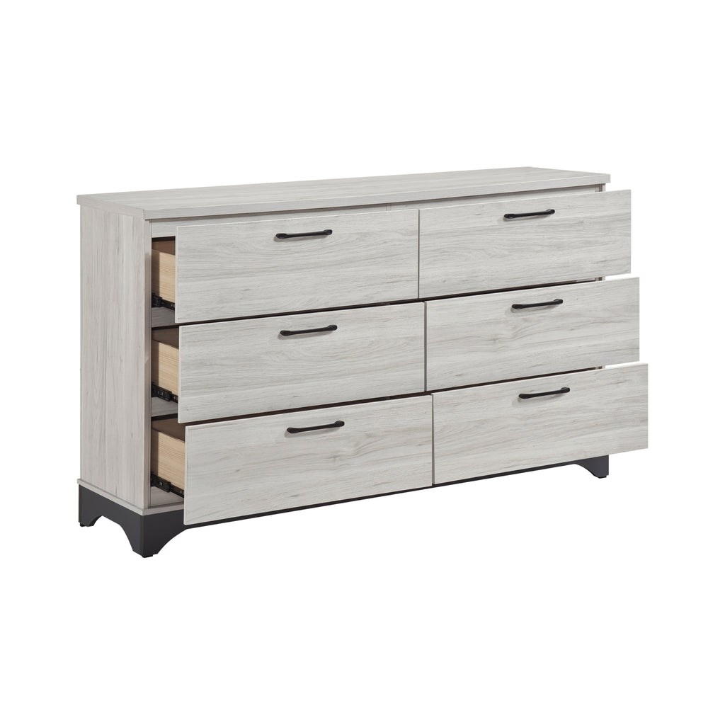 Bring a chic, contemporary update to your bedroom with this stunning two-tone dresser, ready to enhance your space without any assembly hassle. The striking combination of a light white oak wood grain and a sophisticated gray finish provides a fresh, modern aesthetic that effortlessly elevates any decor. With six spacious drawers that glide smoothly on premium ball-bearing glides, this dresser offers ample storage to organize your entire wardrobe. The sleek black-tone bar pulls provide a stylish contrast, while the durable construction ensures lasting quality and a beautiful centerpiece for your bedroom.