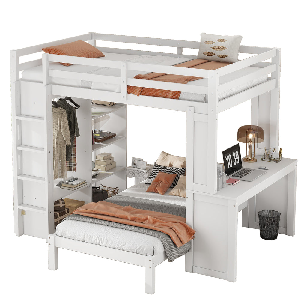 Maximize space with this Full Loft Bed, featuring ample built-in storage, a versatile desk, and a dismountable lower bed for ultimate flexibility. Crafted from solid wood with full-length guardrails, it ensures safety and durability for years to come. Perfect for organizing, studying, and accommodating guests, this multi-functional loft bed elevates any bedroom or dorm with its sleek design.