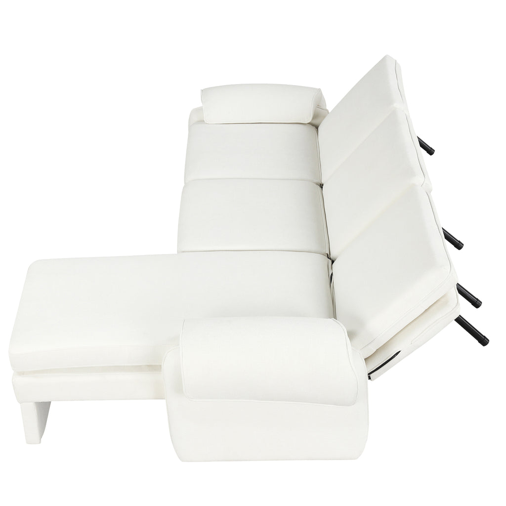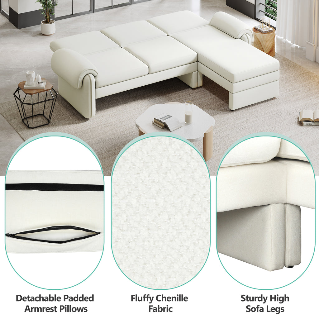 This versatile L-shaped sofa combines style, comfort, and functionality to elevate any living space. Featuring a reversible chaise lounge, it allows you to easily switch the left and right positions to suit your room layout and personal preferences. The adjustable backrest offers a customized range from 90 to 180 degrees, ensuring optimal comfort whether you're sitting, reclining, or lying flat for sleep. The detachable padded armrest pillows provide ergonomic support for your cervical spine, enhancing relaxation while being removable for easy cleaning. Sturdy high legs not only add a modern, elegant touch but also facilitate easy cleaning underneath. Upholstered in luxurious chenille fabric, this sofa bed boasts a soft, cozy texture, creating a tranquil, inviting atmosphere in your home. Perfect for those seeking a blend of practicality and comfort, this sofa adapts to your needs and enhances the flow of your living space.