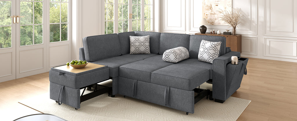 This multifunctional L-shaped sleeper sofa is the perfect all-in-one solution for modern living. It features dual pull-out beds—one large and one small—for flexible sleeping arrangements, along with a flip-top table built into the smaller pull-out unit. The right armrest includes smart upgrades like two USB ports, a cup holders, and a hidden storage box. Complete with matching pillows for added comfort and style, this compact sectional seamlessly combines seating, sleeping, and storage—ideal for small apartments, guest rooms, or multifunctional spaces.