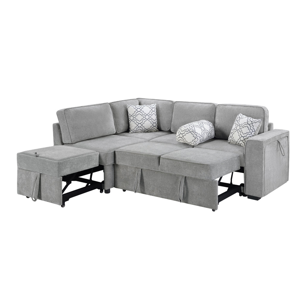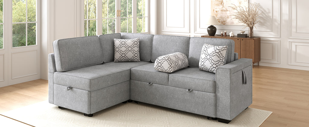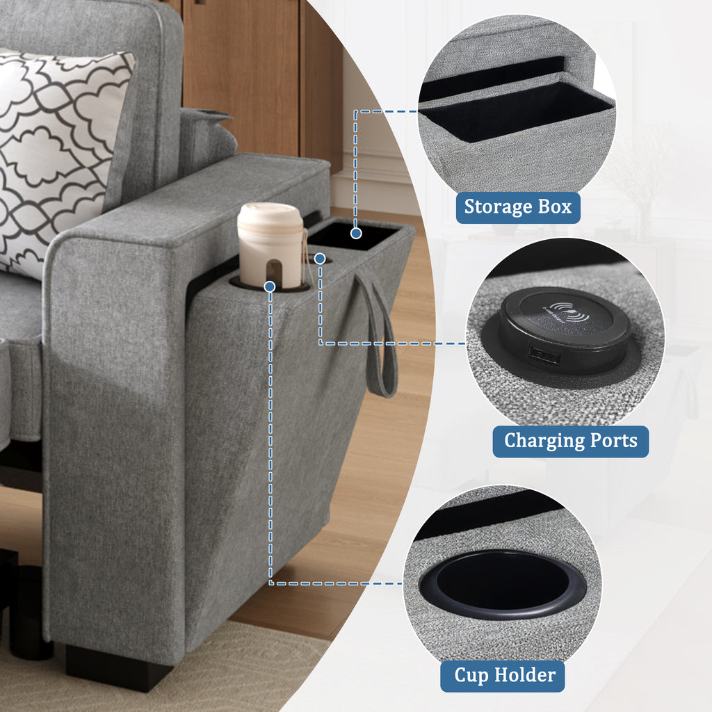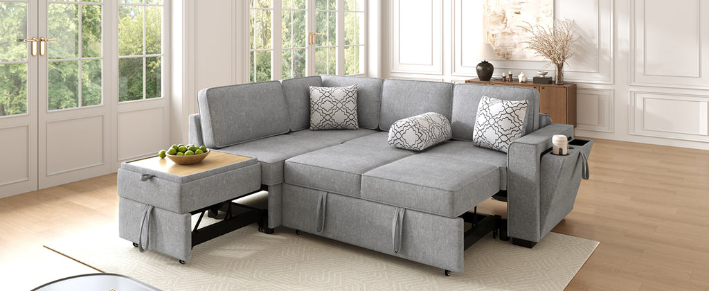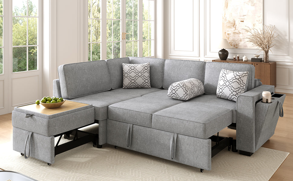 This multifunctional L-shaped sleeper sofa is the perfect all-in-one solution for modern living. It features dual pull-out beds—one large and one small—for flexible sleeping arrangements, along with a flip-top table built into the smaller pull-out unit. The right armrest includes smart upgrades like two USB ports, a cup holders, and a hidden storage box. Complete with matching pillows for added comfort and style, this compact sectional seamlessly combines seating, sleeping, and storage—ideal for small apartments, guest rooms, or multifunctional spaces.