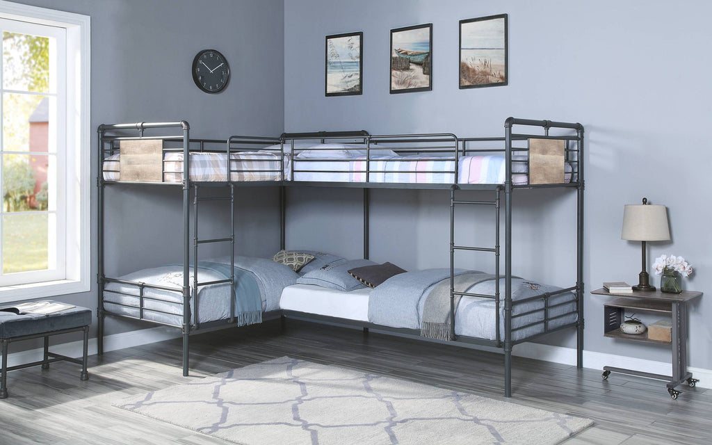 - L Shape Bunk Bed, Box Spring Not Required, Includes Slat System( 20 Slats/each bed) and Safety Guard Rails, Bunkie Board Not Required, Fixed Left and Right Facing Ladders, Mattress is Not Included, Water Pipe Style