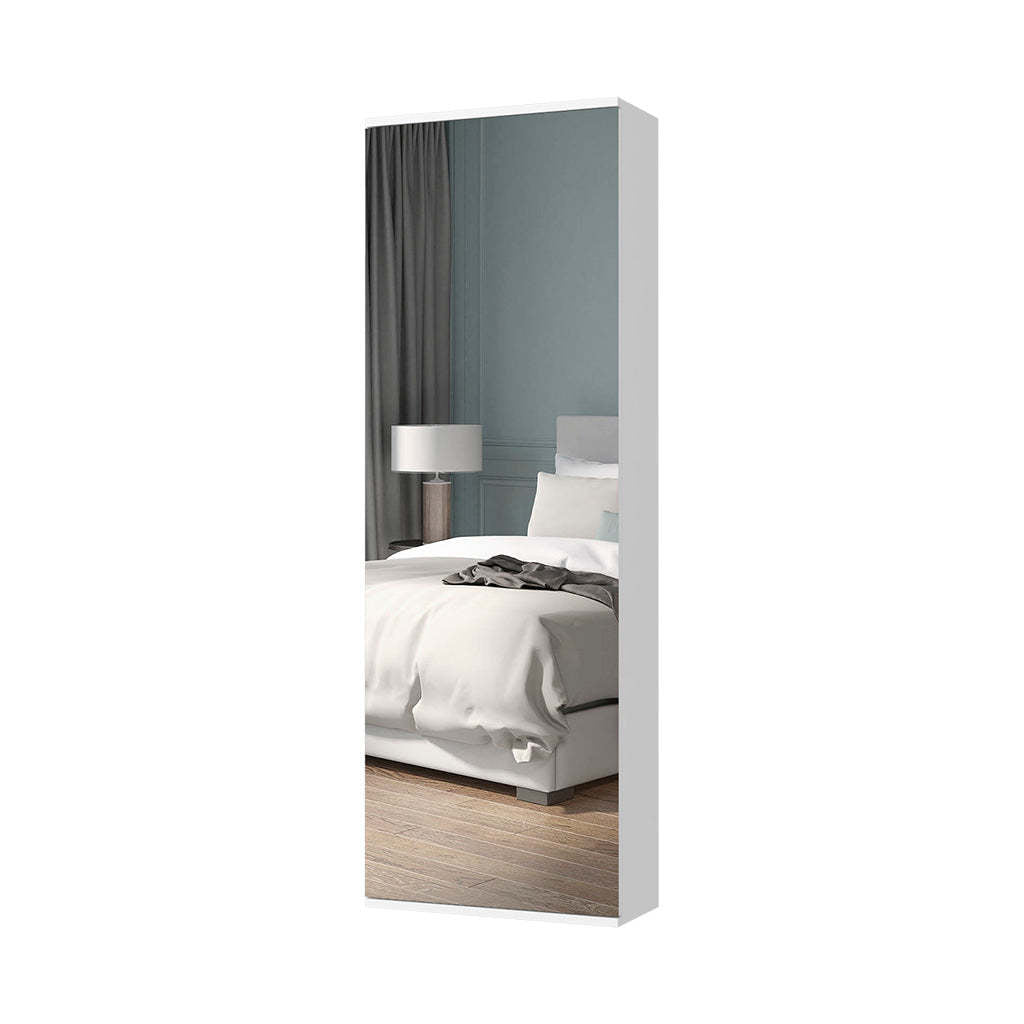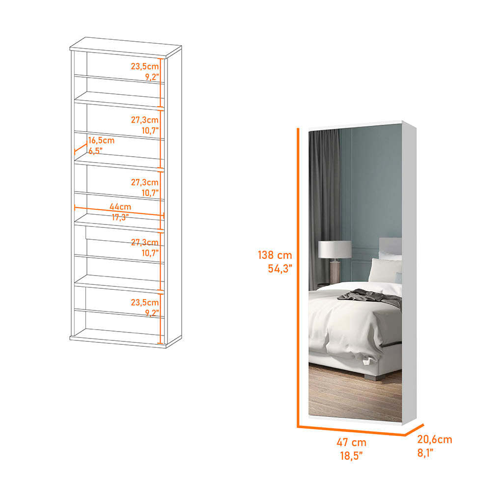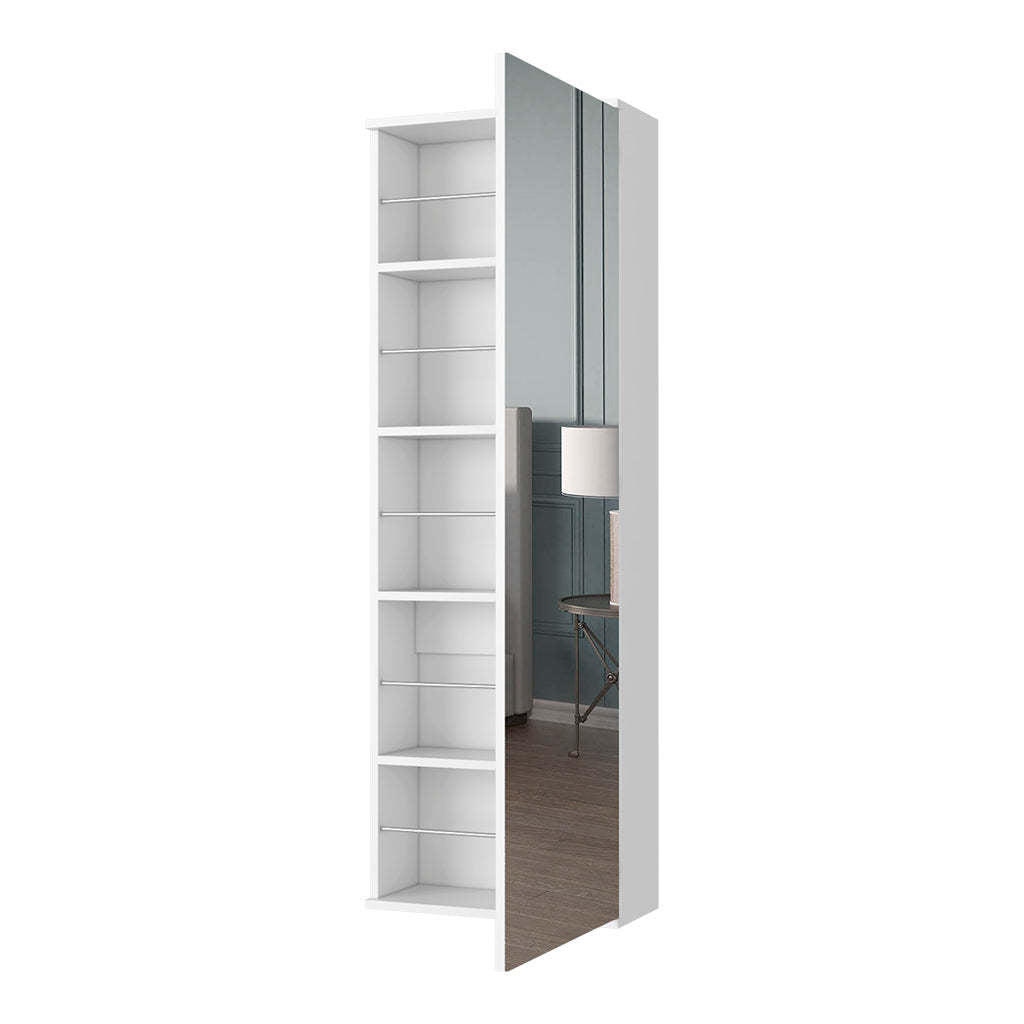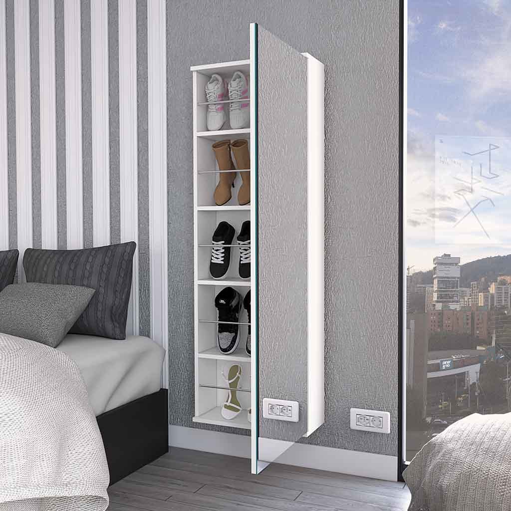 'Connecticut Wall Mounted Shoe Rack w/ Mirror is designed for people who are tired of storing their shoes traditionally. Thanks to this, you can avoid stacking your boots or your family's shoes on the door of your house, which makes it look disorganized. The Connecticut Wall Mounted Shoe Rack has a mirror door that gives it a very fancy, practical, and innovative touch; you can quickly check out your look for the day before choosing what shoes to wear with your outfit. Inside it has five shelves, each one of them can store two pairs of shoes, tennis shoes, heels or sandals.