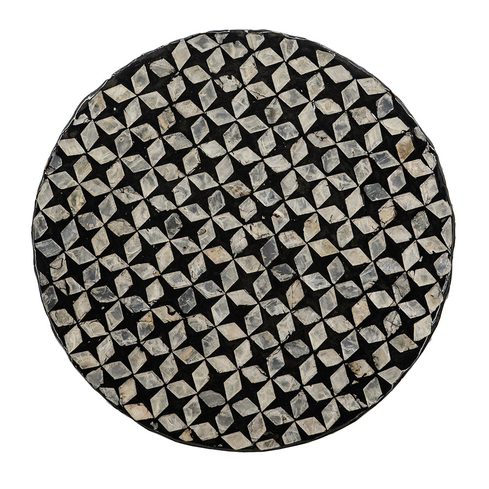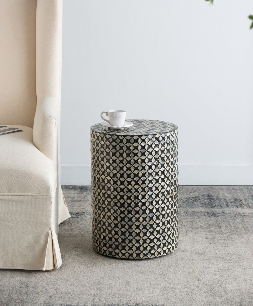 This black accent stool features Capiz inlay within its geometric patterning and works beautifully in a living room or family room. The cylindrical structure gives the piece contemporary appeal and versatility within any layout. The round surface makes this equally useful as a stool or a tabletop.