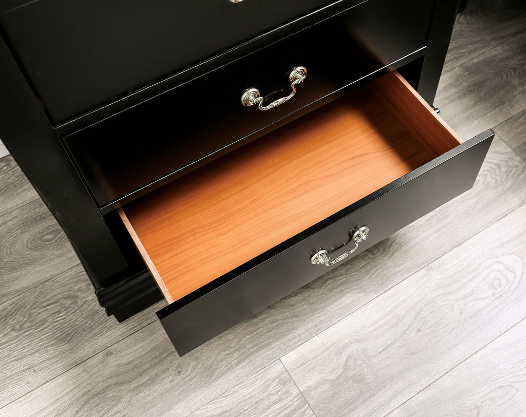 A transitional design in a crisp balck finish—harmonizing traditional charm with modern appeal. Finished with nickel bail (hanging) drawer pulls and bracket feet for a refined and stable base. Features English dovetail joinery and dust-proof cases, ensuring longevity and smooth operation.