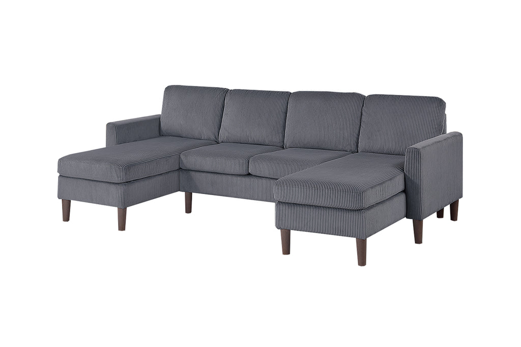 Enhance your home with the perfect combination of modern elegance and cozy relaxation. The dual chaises on either side create the ultimate relaxation zones, allowing multiple people to lounge at once without feeling crowded. Whether you're stretching out with a good book, enjoying a movie night, or entertaining guests, this sectional adapts effortlessly to your lifestyle. The armless two-seater section in the middle keeps the layout open and seamless, making the sectional feel even more spacious. Wrapped in soft and textured corduroy fabric, the sectional provides a plush, inviting feel that enhances both comfort and style. The deep ridges of the corduroy upholstery not only add a sophisticated touch but also create a warm and cozy atmosphere. The durable material ensures longevity, making it an excellent choice for everyday use. With its modern silhouette, the sectional features sleek square arms that give it a structured and contemporary look. With its luxurious corduroy upholstery, modern square arms, elegant tapered legs, and dual chaise seating, this sectional delivers the perfect combination of contemporary design and inviting comfort.