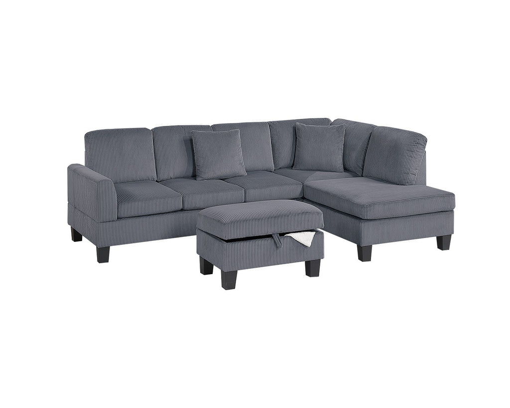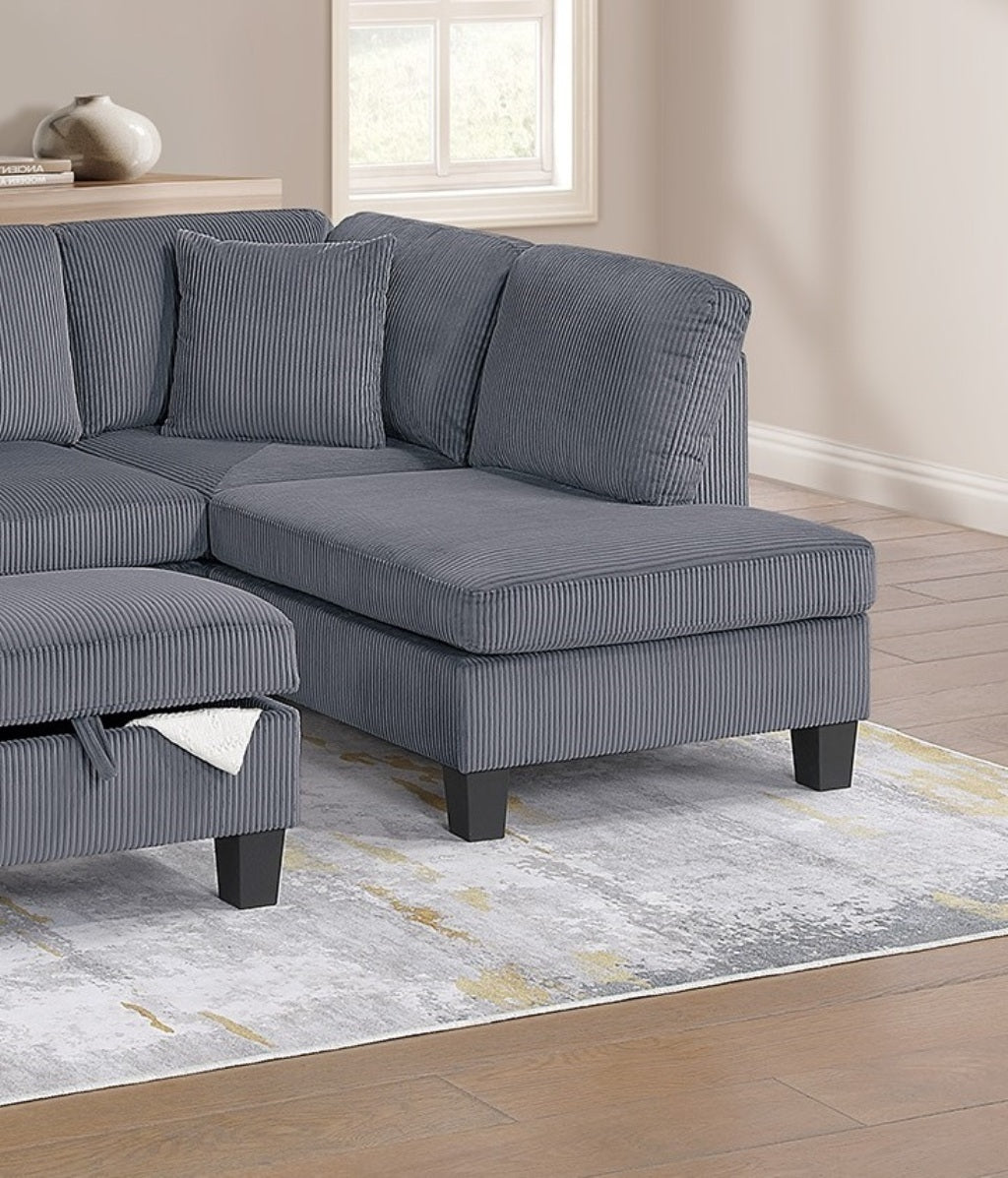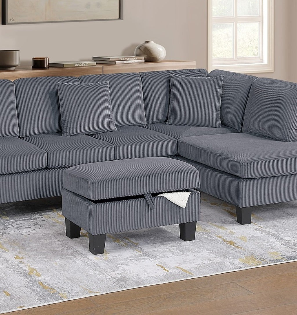Whether you’re entertaining guests or simply unwinding after a long day, this sectional provides the ultimate lounging experience. This sectional set includes a Right-Arm-Facing (RAF) Chaise, a spacious Sofa, and a Multi-Purpose Storage Ottoman, offering plenty of room to stretch out and unwind. The RAF chaise provides the perfect spot to kick back, whether you’re watching TV, reading a book, or simply enjoying a moment of relaxation. The coordinating storage ottoman adds another layer of versatility, serving as a footrest, an extra seating option, or even a coffee table alternative. Lift the cushioned top to reveal a hidden storage compartment, ideal for keeping blankets, magazines, or remote controls organized and within reach. Wrapped in a soft, textured corduroy fabric, this sectional set is designed for both style and relaxation. The deep, well-padded seats provide a cloud-like feel, while the supportive back cushions cradle you in comfort. The ribbed texture of the corduroy adds depth and dimension, giving the sectional a rich, inviting look that complements a variety of home décor styles. To complete the look, this sectional set comes with two matching accent pillows, adding a touch of contrast and extra comfort. These pillows not only enhance the sectional’s aesthetic appeal but also provide additional lumbar support for a cozy lounging experience.