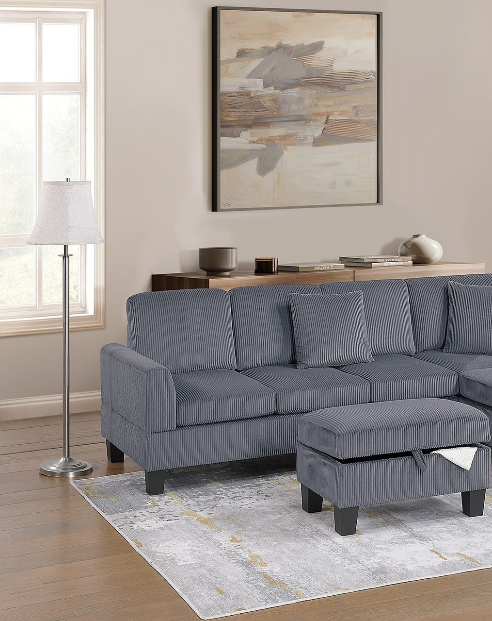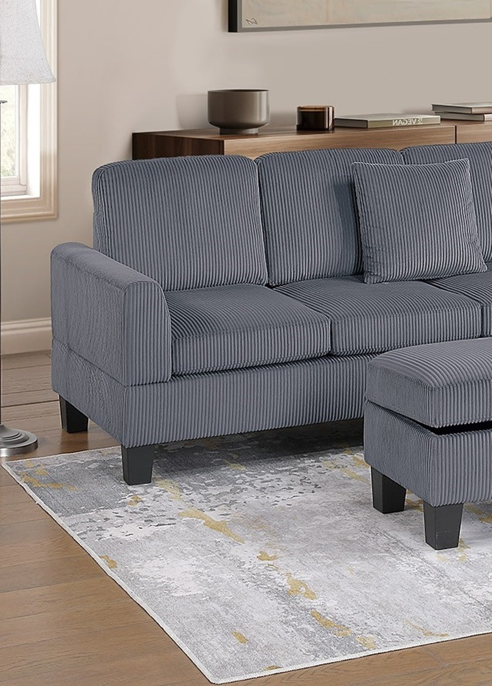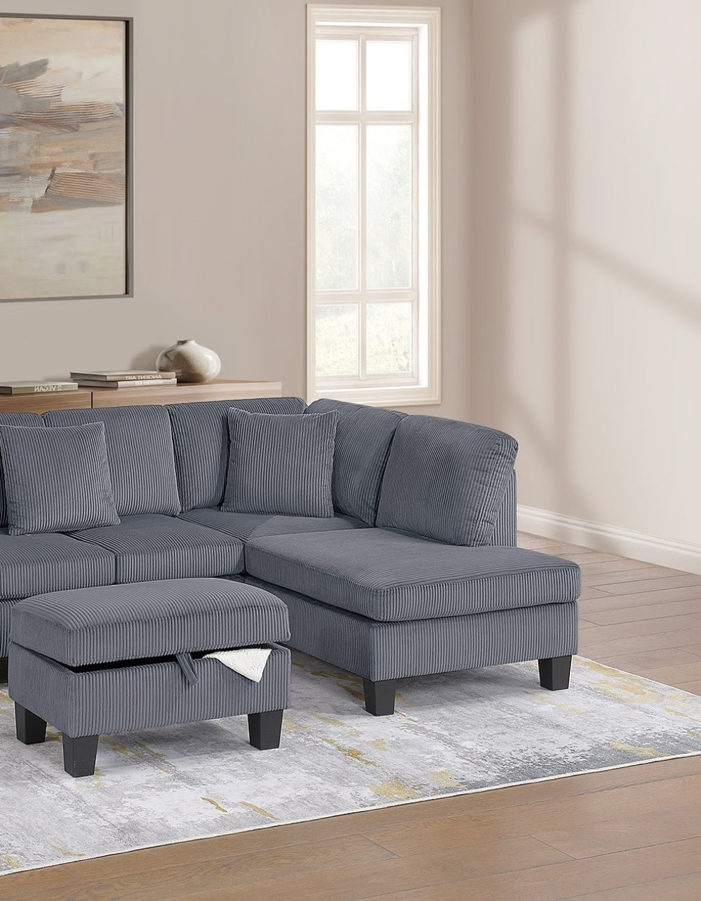 Whether you’re entertaining guests or simply unwinding after a long day, this sectional provides the ultimate lounging experience. This sectional set includes a Right-Arm-Facing (RAF) Chaise, a spacious Sofa, and a Multi-Purpose Storage Ottoman, offering plenty of room to stretch out and unwind. The RAF chaise provides the perfect spot to kick back, whether you’re watching TV, reading a book, or simply enjoying a moment of relaxation. The coordinating storage ottoman adds another layer of versatility, serving as a footrest, an extra seating option, or even a coffee table alternative. Lift the cushioned top to reveal a hidden storage compartment, ideal for keeping blankets, magazines, or remote controls organized and within reach. Wrapped in a soft, textured corduroy fabric, this sectional set is designed for both style and relaxation. The deep, well-padded seats provide a cloud-like feel, while the supportive back cushions cradle you in comfort. The ribbed texture of the corduroy adds depth and dimension, giving the sectional a rich, inviting look that complements a variety of home décor styles. To complete the look, this sectional set comes with two matching accent pillows, adding a touch of contrast and extra comfort. These pillows not only enhance the sectional’s aesthetic appeal but also provide additional lumbar support for a cozy lounging experience.