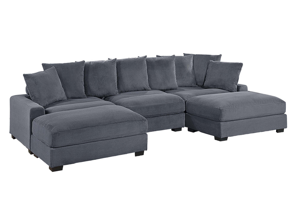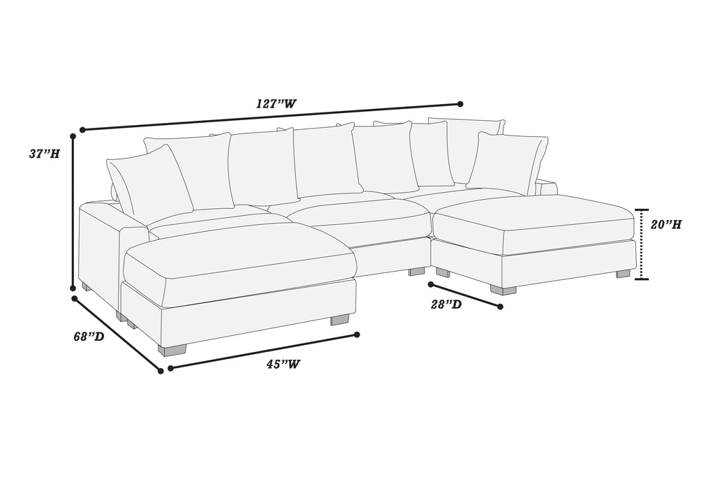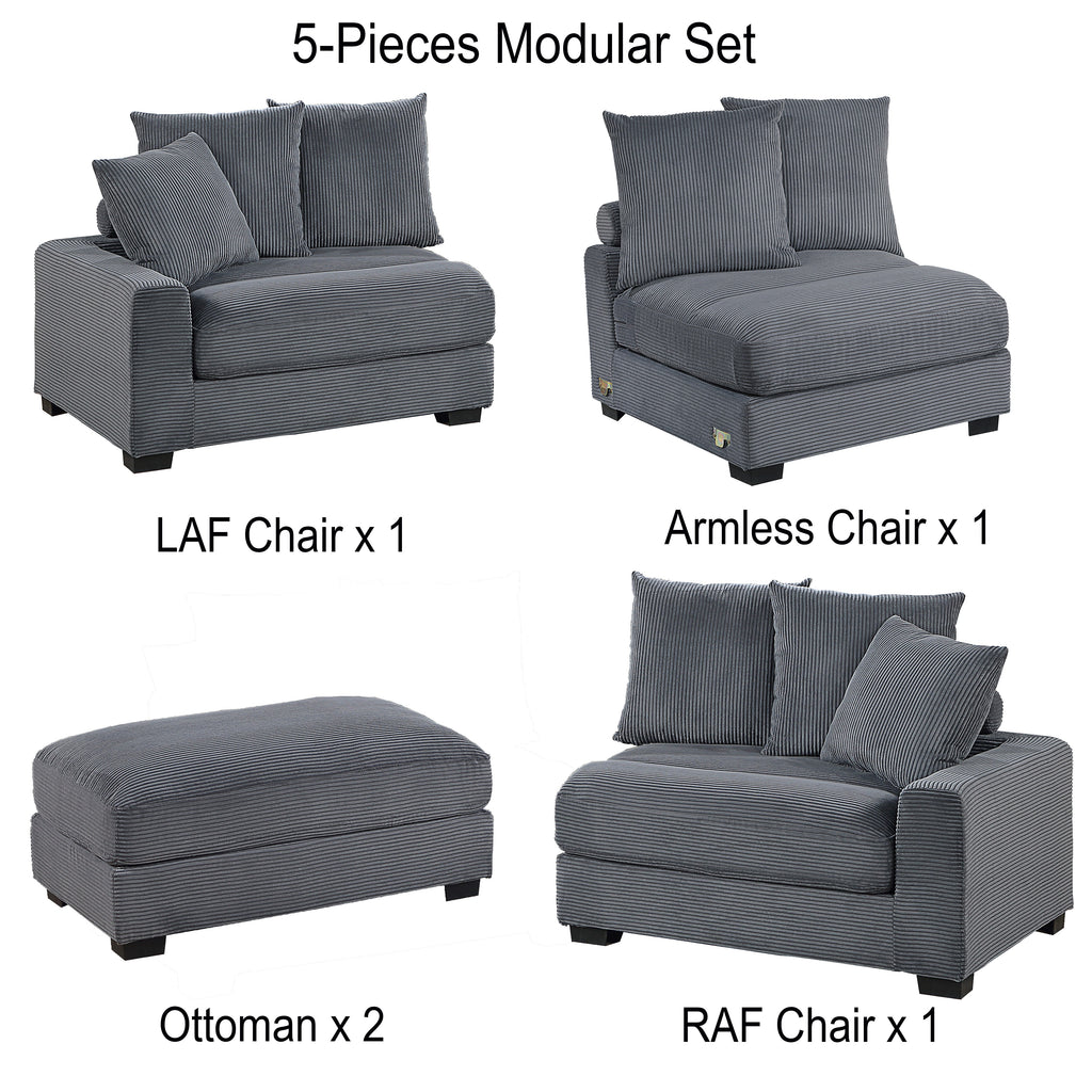 Unwind in endless configurations with the stunning modular sectional. This 5-piece sectional offers the perfect blend of flexibility and style. With a Left Arm Facing Chair, Right Arm Facing Chair, Armless Chair, and Ottoman, you can create the ideal layout for your living space. The square arms offer a contemporary touch, while the low legs contribute to a modern aesthetic that complements any interior décor. This sectional comes complete with 6 luxurious back pillows and 2 throw pillows, adding a touch of elegance and providing extra lumbar support. Whether you're lounging with family or entertaining guests, this modular sectional promises unparalleled comfort and versatility for any occasion.