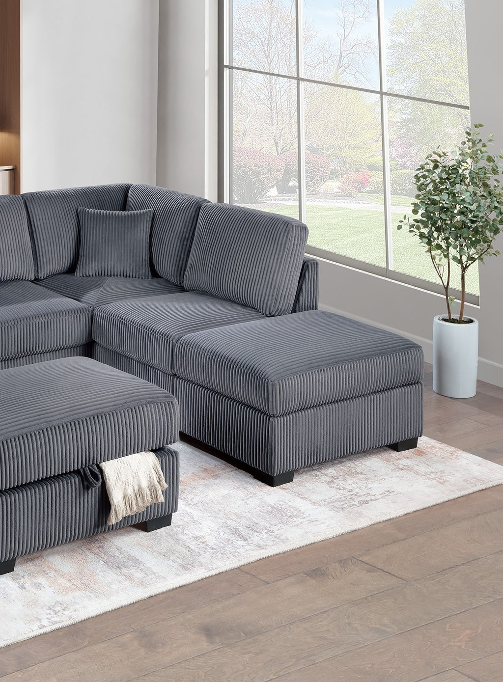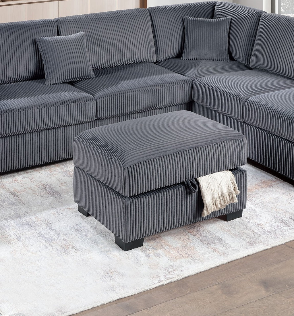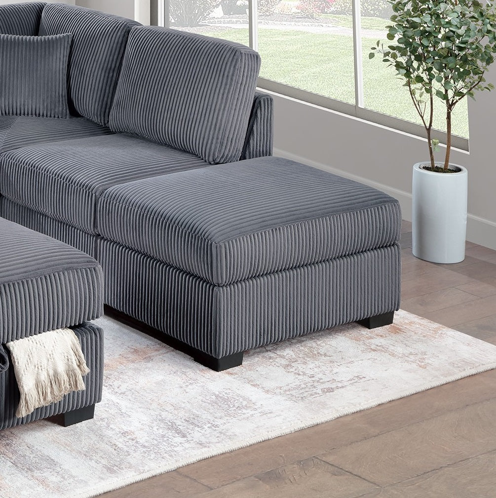 The 3-Piece L-Shaped Sectional Set with storage Ottoman brings a perfect combination of modern design and inviting comfort to any living space. Upholstered in luxuriously wide-welt corduroy, this sectional offers a cozy yet sophisticated feel, making it the ideal centerpiece for relaxation and style. The L-shaped layout design optimizes both seating and room arrangement, perfect for lounging, entertaining, or unwinding after a long day. The ottoman serves as a versatile addition, functioning as a footrest, an extra seat, or even a stylish coffee table alternative when paired with a tray. Designed with comfort in mind, this sectional features plush back cushions that provide soft, supportive seating for hours of relaxation. Two included throw pillows enhance the cozy appeal, while the two small side cushions offer additional arm support, ensuring a more comfortable lounging experience. Whether placed in a contemporary, minimalist, or cozy living room setting, this sectional adapts effortlessly, making it a versatile and stylish choice for any home.