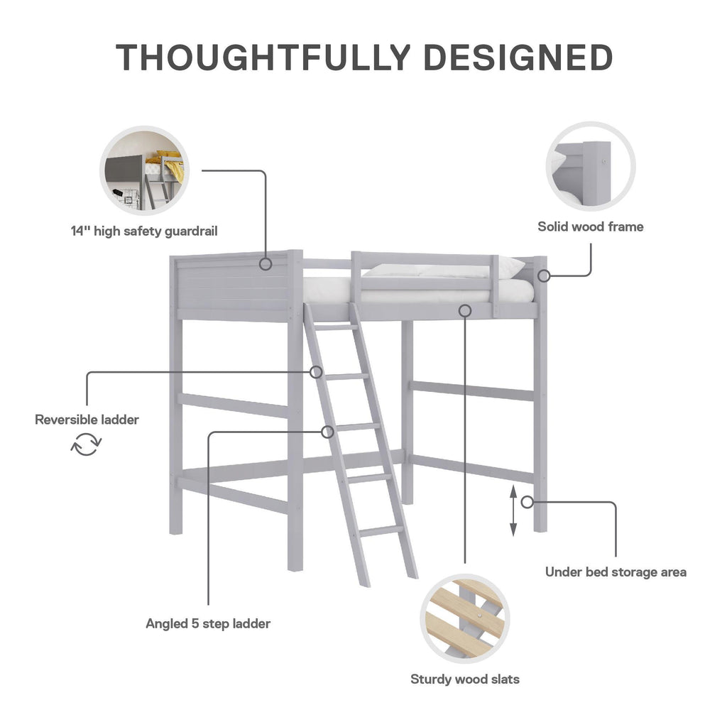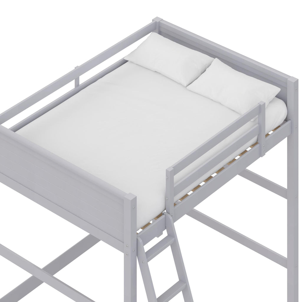 The Denver Full Size Loft Bed brings a functional, playful and modern design to your child's room, allowing you to reclaim much need floor space in style with a beautiful centerpiece. The Denver's spacious area underneath the bed is the perfect place to create a useful workstation, seating lounge or anything else you can think of. With a sturdy wood construction and a bold gray finish, this customizable loft bed will easily fit into any new or existing decor, bringing a simple, traditional design that draws attention to its clean lines, horizontal paneling and space-saving silhouette. Safety features includes a 5-step ladder for easy access up and down and full-length guardrails to prevent falls during the night. Beloved by parents for its functionality and compact footprint and loved by kids for the fun factor, the Denver Full Size Loft Bed brings a complete sleep, study and play solution to keep everyone happy. Children must be at least 6 years old to use the top bunk.