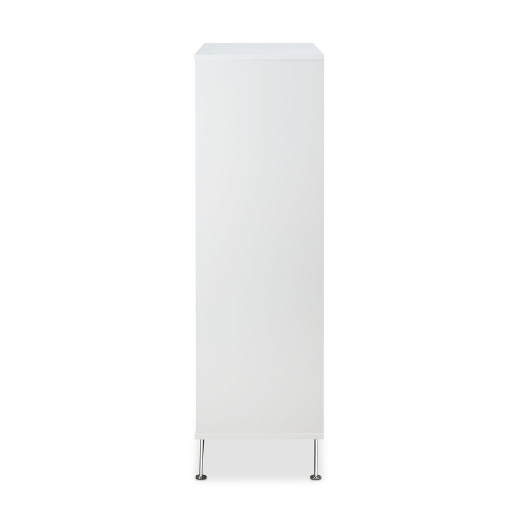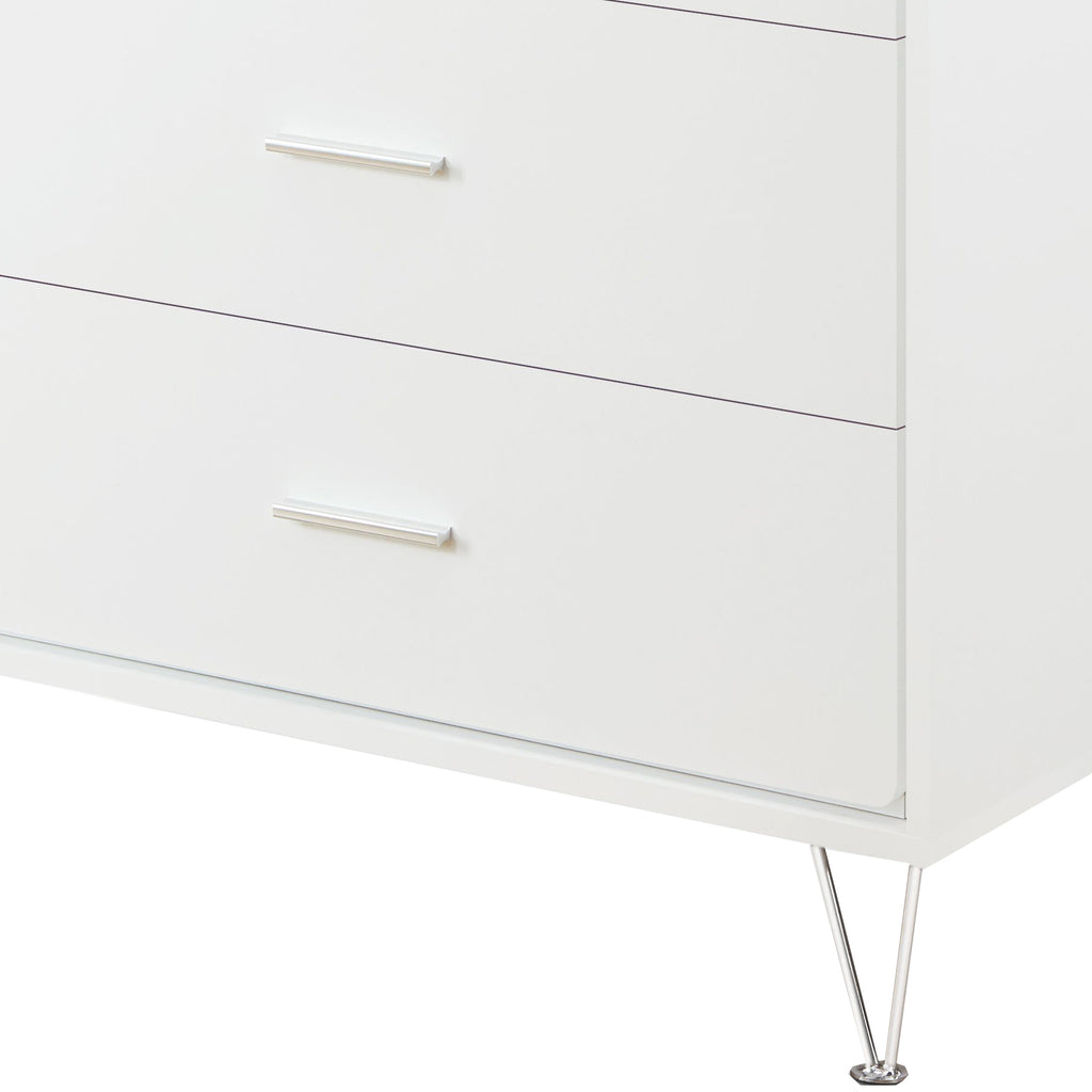 - The chrome-finished metal legs add a touch of contemporary elegance and elevate the overall design, while the single handle on each drawer provides a minimalist yet functional hardware detail.