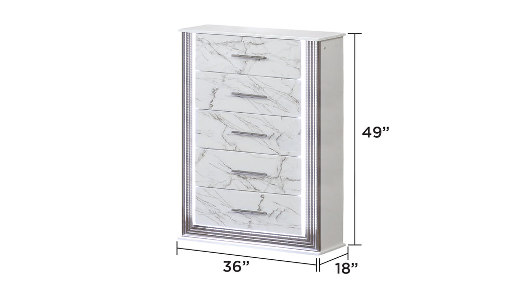 Transform your bedroom into a modern retreat with this luxurious bedroom set, available in both 4-piece and 5-piece options to suit your space and storage needs. Each set includes a stunning bed featuring a plush, vertically channeled headboard with integrated LED lighting, and a footboard with deep storage drawers. The dresser, with its marble-inspired drawer fronts and clean white finish, pairs perfectly with the matching mirror, framed in polished metallic trim with ambient LED lighting. The nightstand offers convenient bedside storage, while the 5-piece set adds a spacious chest, completing the ensemble with additional storage space. Crafted from solid and manufactured wood, this set combines durability with a sleek, contemporary design.