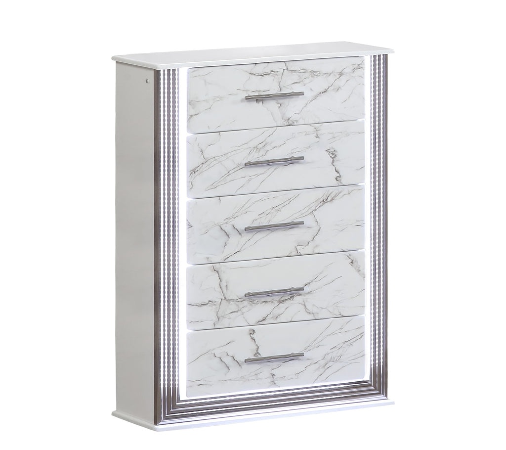 Transform your bedroom into a modern retreat with this luxurious bedroom set, available in both 4-piece and 5-piece options to suit your space and storage needs. Each set includes a stunning bed featuring a plush, vertically channeled headboard with integrated LED lighting, and a footboard with deep storage drawers. The dresser, with its marble-inspired drawer fronts and clean white finish, pairs perfectly with the matching mirror, framed in polished metallic trim with ambient LED lighting. The nightstand offers convenient bedside storage, while the 5-piece set adds a spacious chest, completing the ensemble with additional storage space. Crafted from solid and manufactured wood, this set combines durability with a sleek, contemporary design.