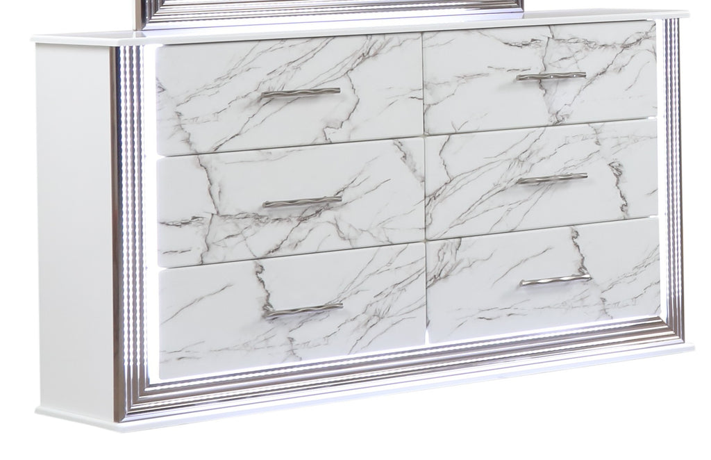 This sophisticated dresser blends modern style with practical storage, making it an ideal addition to any contemporary bedroom. It features a sleek white finish with marble-inspired drawer fronts, adding a touch of luxury and elegance to its design. The six spacious drawers provide ample storage for clothing, linens, or accessories, ensuring a clutter-free space. Each drawer is fitted with streamlined metallic handles, adding a refined accent that complements the dresser’s overall aesthetic. The sturdy construction, crafted from a mix of solid and manufactured wood, ensures durability while maintaining a stylish and polished appearance.
