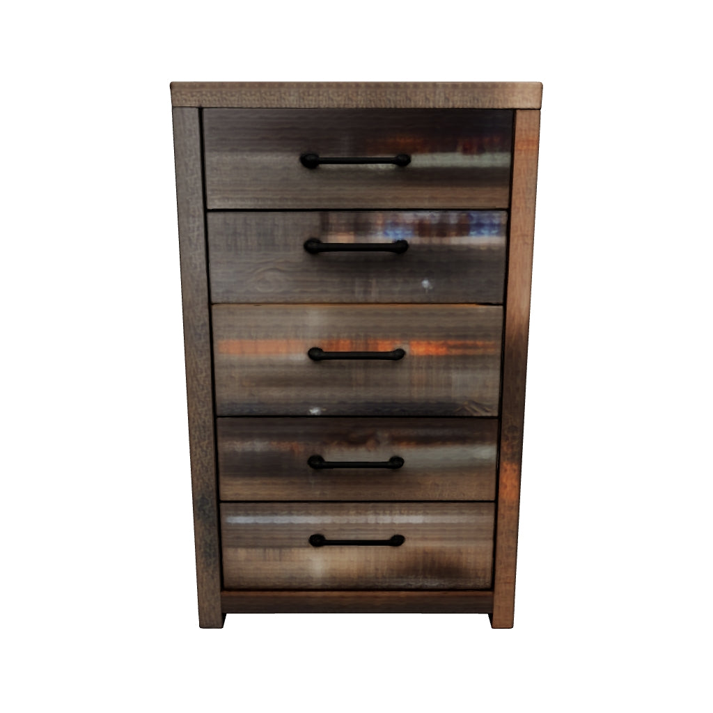 When merged in just the right way, rustic and industrial styles can make one happy marriage. Case in point: this bedroom chest. A refined take on barn board beauty, its complex, replicated wood grain showcases hints of burnt orange and teal tones for a sense of weatherworn authenticity. Elongated drawer pulls elevate the aesthetic.