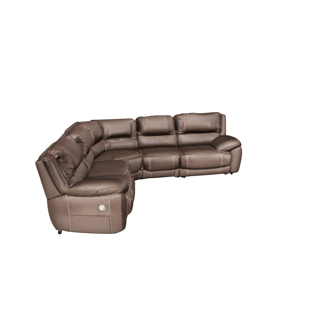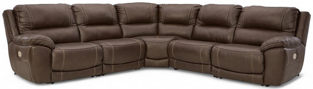Load up on comfort in a cool, clean-lined and contemporary way with the Dunleith power reclining sectional. Rest assured, you'll enjoy the feel of real leather everywhere your body touches (real leather interior seating/matching faux leather exterior). With a wonderfully soft hand, the heavyweight material is enriched with a pebble grain effect for authentic appeal and enhanced with jumbo stitching for dramatic contrast. It features a one-touch power control with adjustable positions and includes an Easy View™ adjustable headrest that allows a primo view of the TV even when you're reclined. Extended ottomans provide extra length for leg comfort. A zero-draw USB plug-in at your fingertips lets you charge up as you chill out.