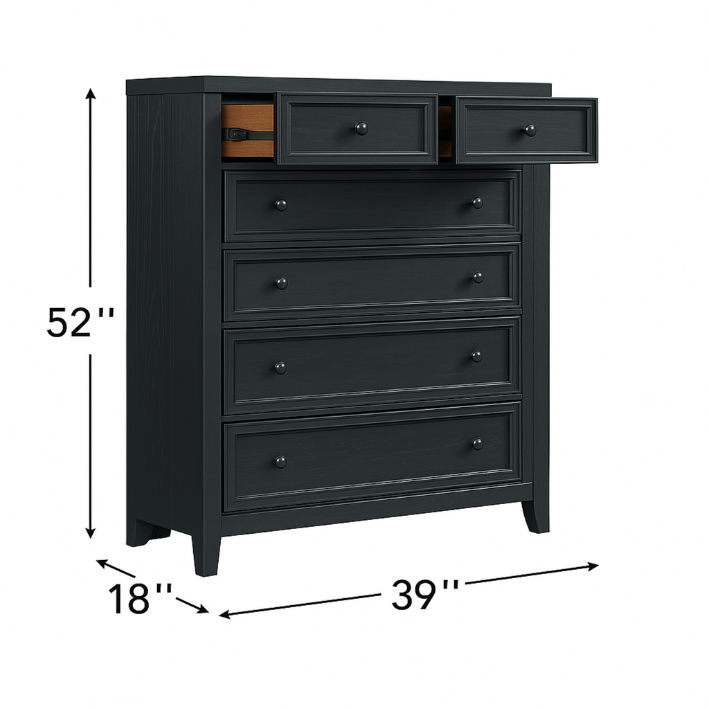 - Classic and functional design with framed drawer fronts and sleek metal knobs