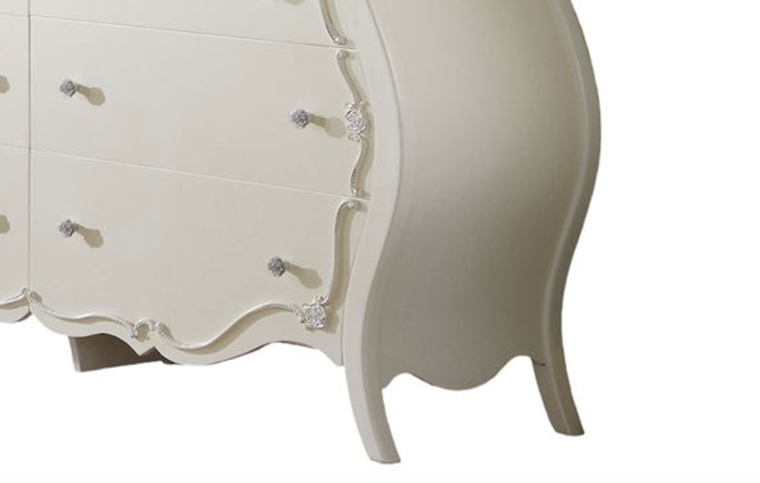 - Finished with elegant nickel rose metal hardware and supported by flared legs, this dresser combines beauty and functionality, making it a perfect addition to any refined bedroom decor.