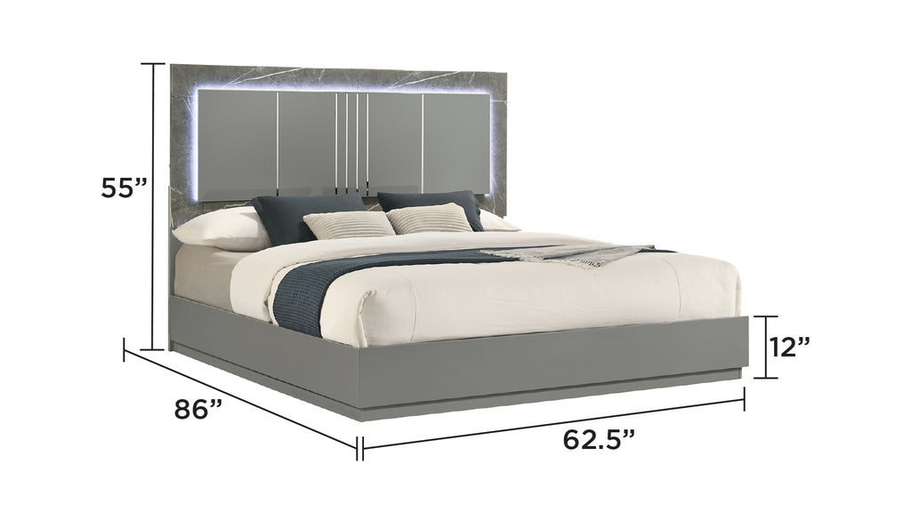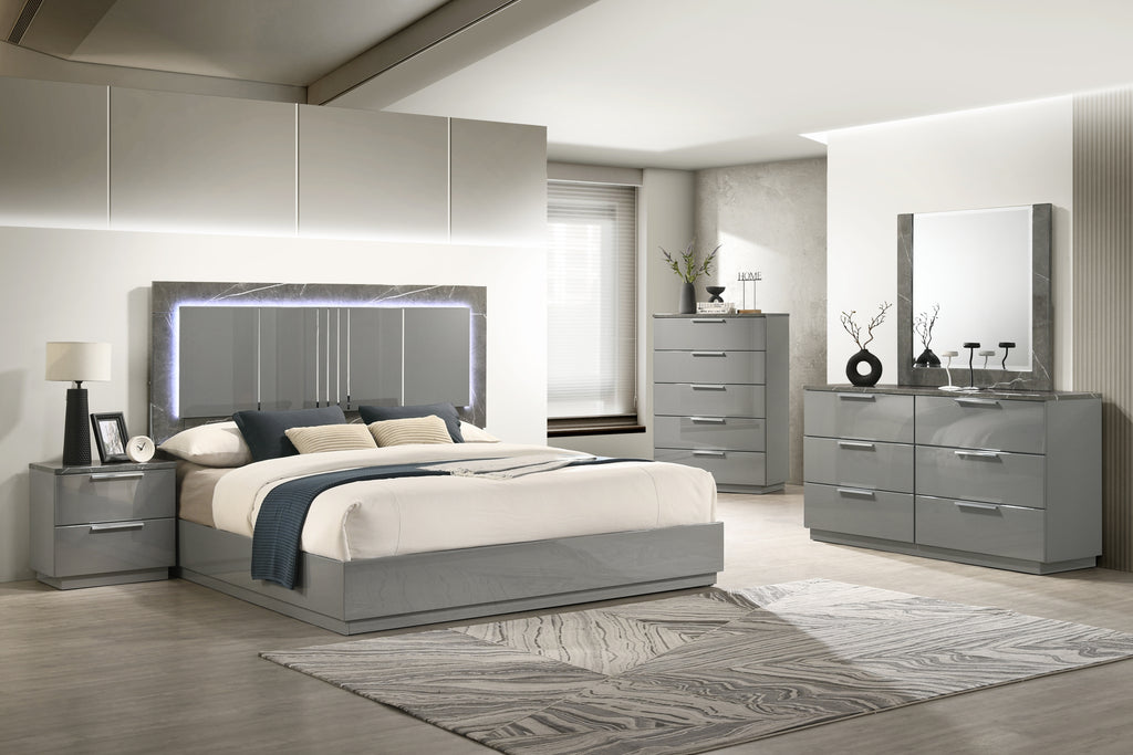 Elevate your bedroom to a realm of sleek sophistication with this luxurious bedroom set, available in both 4-piece and 5-piece configurations. Each set features a contemporary bed with a marble-patterned headboard, ambient LED lighting, and a high-gloss two-tone marble and lacquer finish. The set also includes a matching dresser, nightstand, and an elegant mirror to enhance the room’s ambiance. The 5-piece set adds an additional chest, providing extra storage and a cohesive look with its uniform two-tone high-gloss finish and marble accents. Sleek metal-finished legs complete the modern aesthetic. This bedroom set blends functionality with high-end design, perfect for creating a serene and stylish retreat.