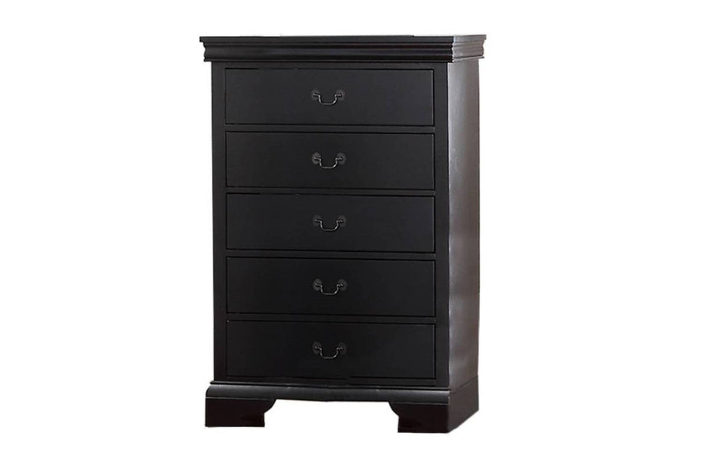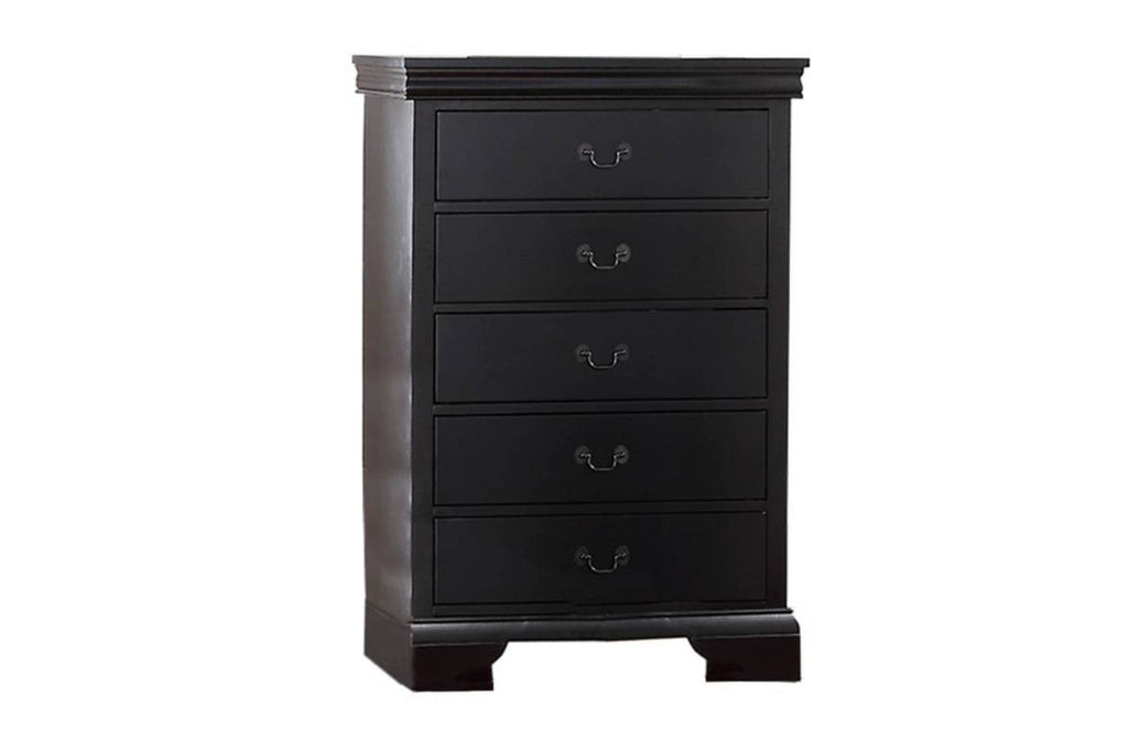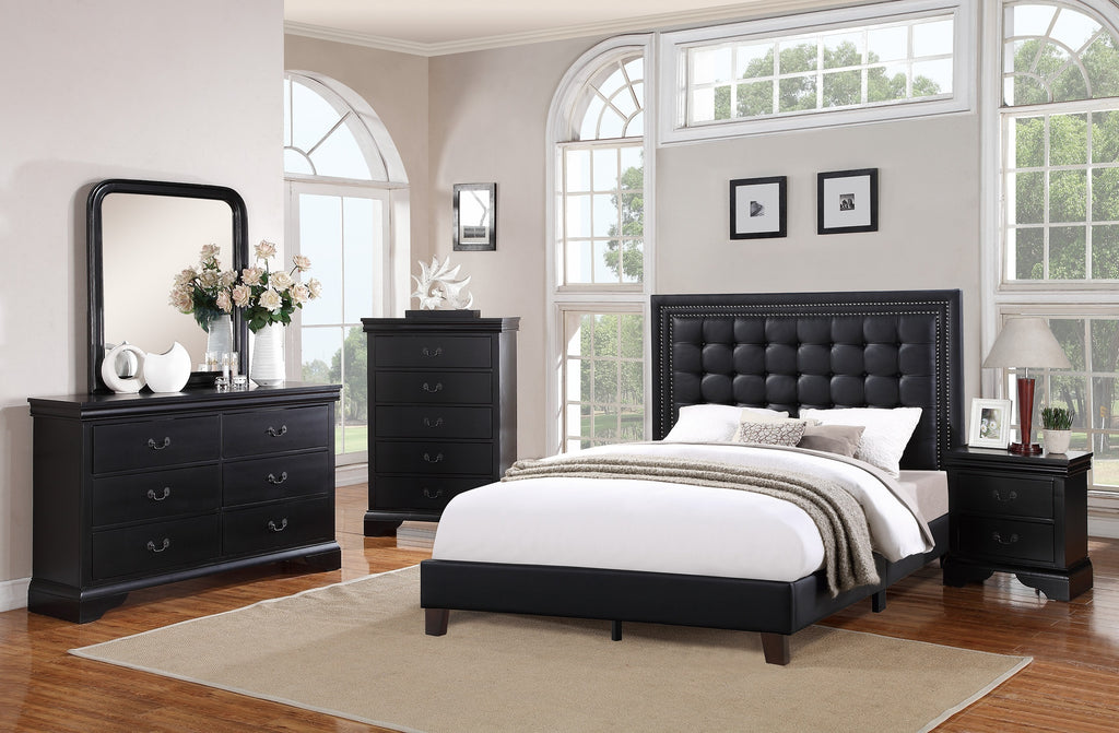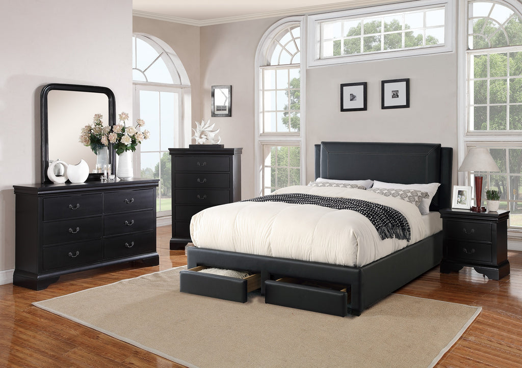 Featuring drawers and display storage amplify a bedroom environment and its functionality. This modern elegance and classic black bed set consists a bed(Optional) headboard with two drawers in the middle and two storage space on the side for you to put in your creativity to decorate and design your space. Including a chest with five drawers provides spacious storage that maximize your bedroom space and keeping the room clean and spotless.