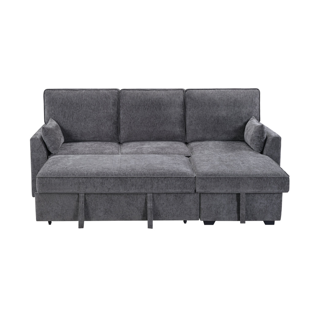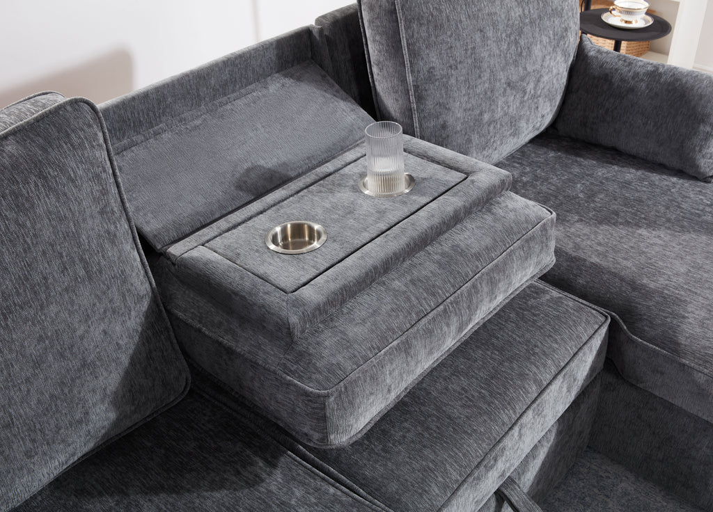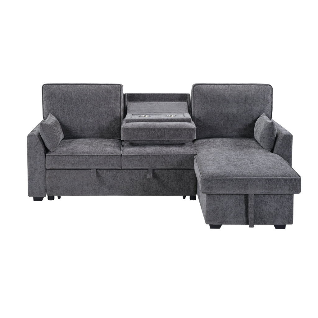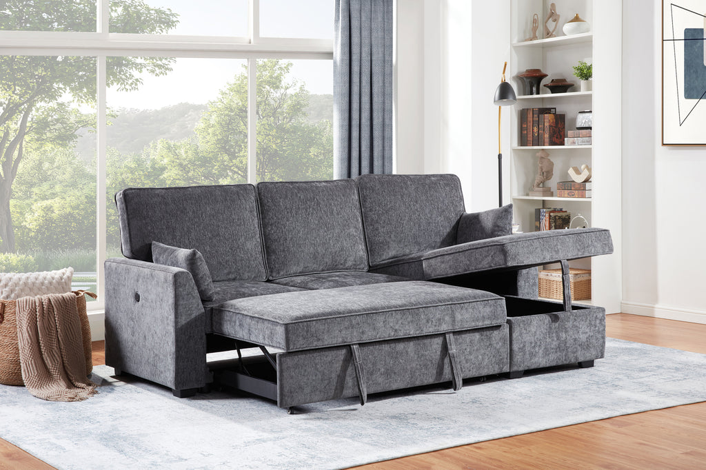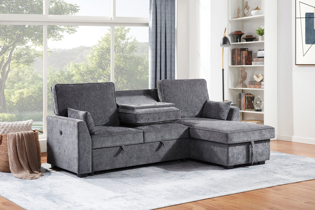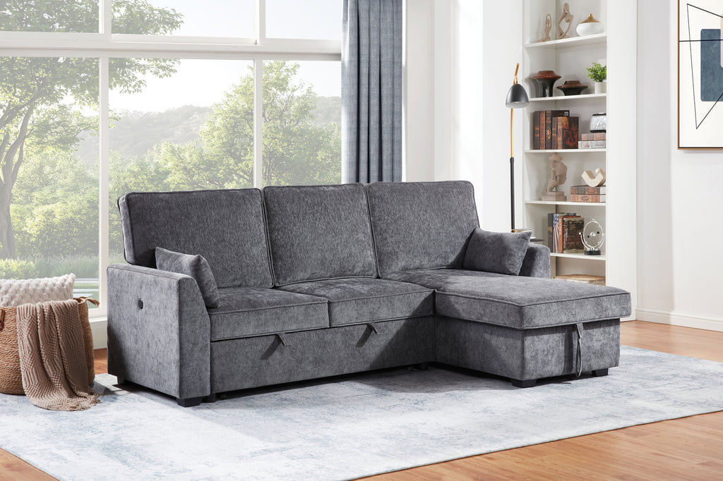 Style meets functionality in the Emmy Fabric Sleeper Sectional, designed to adapt effortlessly to your space and lifestyle. Upholstered in soft, durable fabric, this versatile piece features a reversible storage chaise, giving you flexible layout options and hidden space to tuck away blankets, books, or other living room essentials. Need an extra bed for overnight guests? The Emmy easily transforms into a comfortable sleeper in seconds. Built-in USB charging ports keep your devices powered while you relax, and integrated cupholders make movie nights even more enjoyable. Complete with coordinating plush pillows for added comfort and a modern aesthetic, the Emmy sectional is perfect for maximizing both style and practicality in your home.