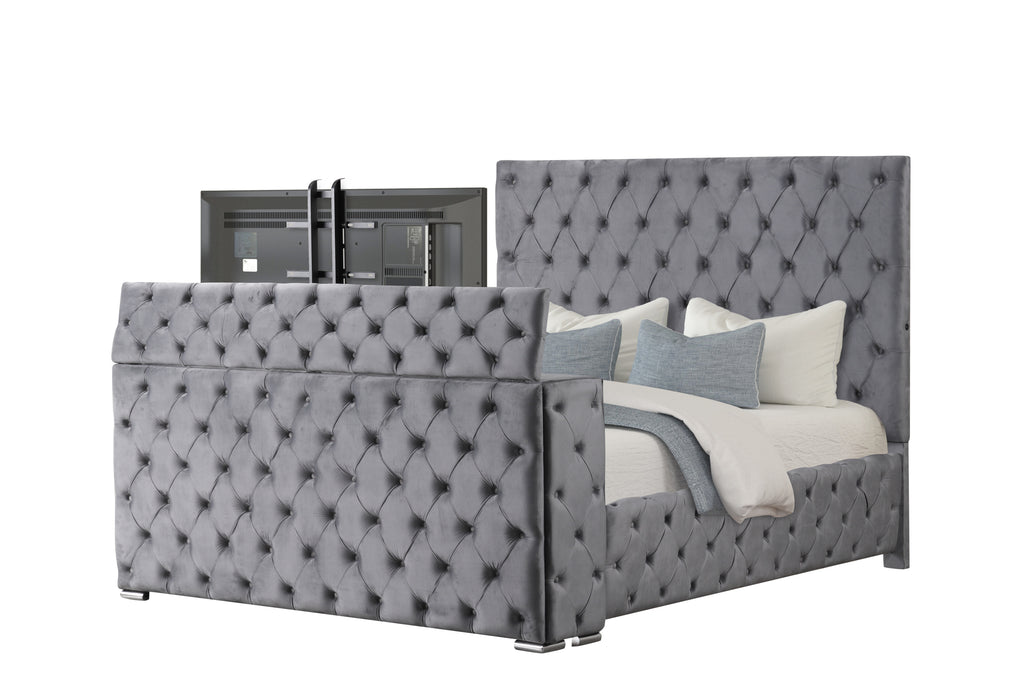 - Bed features built-in TV storage in the footboard (King size holds up to a 50-inch TV, Queen size holds up to a 43-inch TV; TV not included)