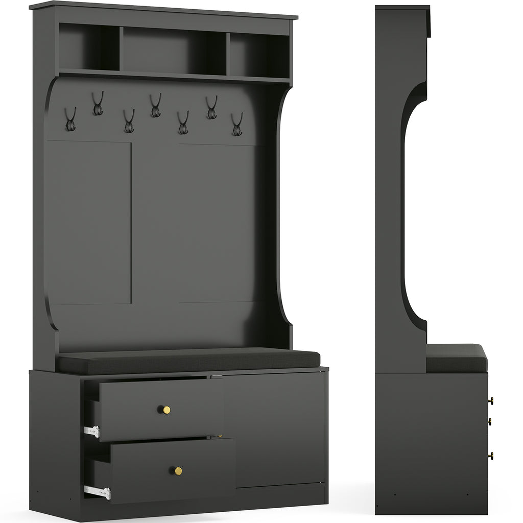 - 6-in-1 Hall Tree with bench and shoe storage: 7 sturdy hooks (15 lbs capacity each) serve as a coat rack replacement.The robust entryway shoe bench features a comfortable 1.6' thick cushion for a pleasant seating experience.2 spacious drawers and an adjustable-height shoe rack allow you to store various sizes of shoes,while the top storage area is perfect for keeping your personal items organized