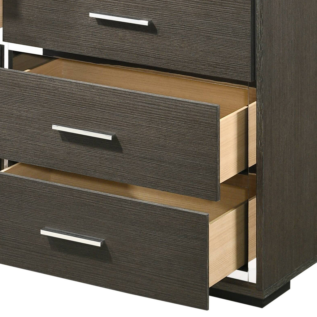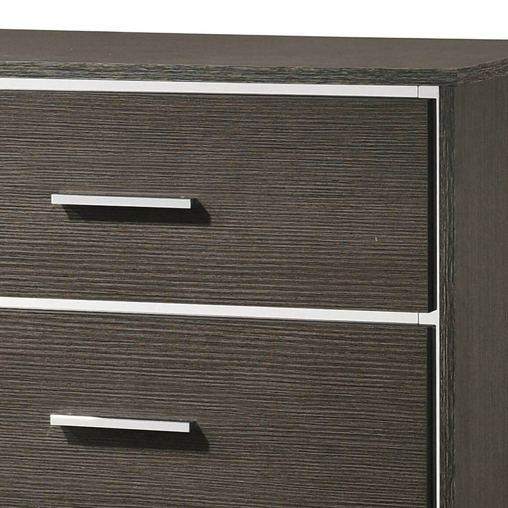 - The dresser's hardware consists of sleek, single pull handles in chromed aluminum, complementing the sophisticated design, and the case is constructed from melamine veneer and particleboard for a sturdy and stylish build.