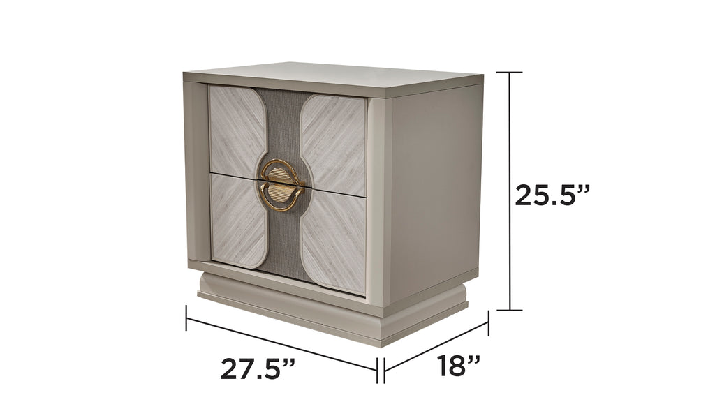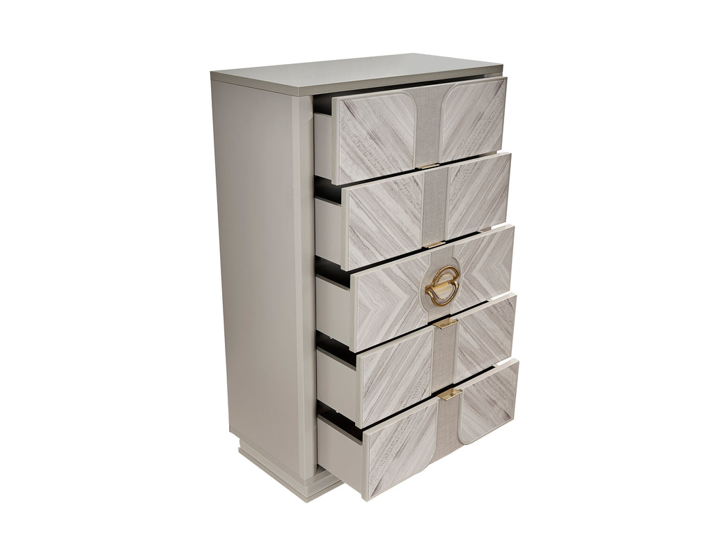 Transform your bedroom into a luxurious retreat with this exquisite bedroom set, available in both 4-piece and 5-piece configurations to perfectly suit your space. The set showcases a refined Eucalyptus-veneer finish throughout, accentuated by a high gloss lacquer that exudes elegance and sophistication. Each piece is thoughtfully designed with modern chrome accents, bringing a contemporary edge to the classic aesthetic. Additionally, the dresser and nightstand include soft-closing drawers, ensuring a smooth and quiet experience. Whether you choose the 4-piece set, including a bed, dresser, mirror, and nightstand, or the 5-piece set with the addition of a chest, this collection offers both style and functionality, making it an ideal centerpiece for your bedroom.